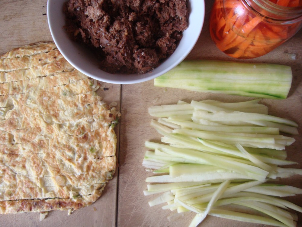 - Add a line each of omelet, seasoned tuna, pickled carrot and crunchy green something to the middle of the rice.