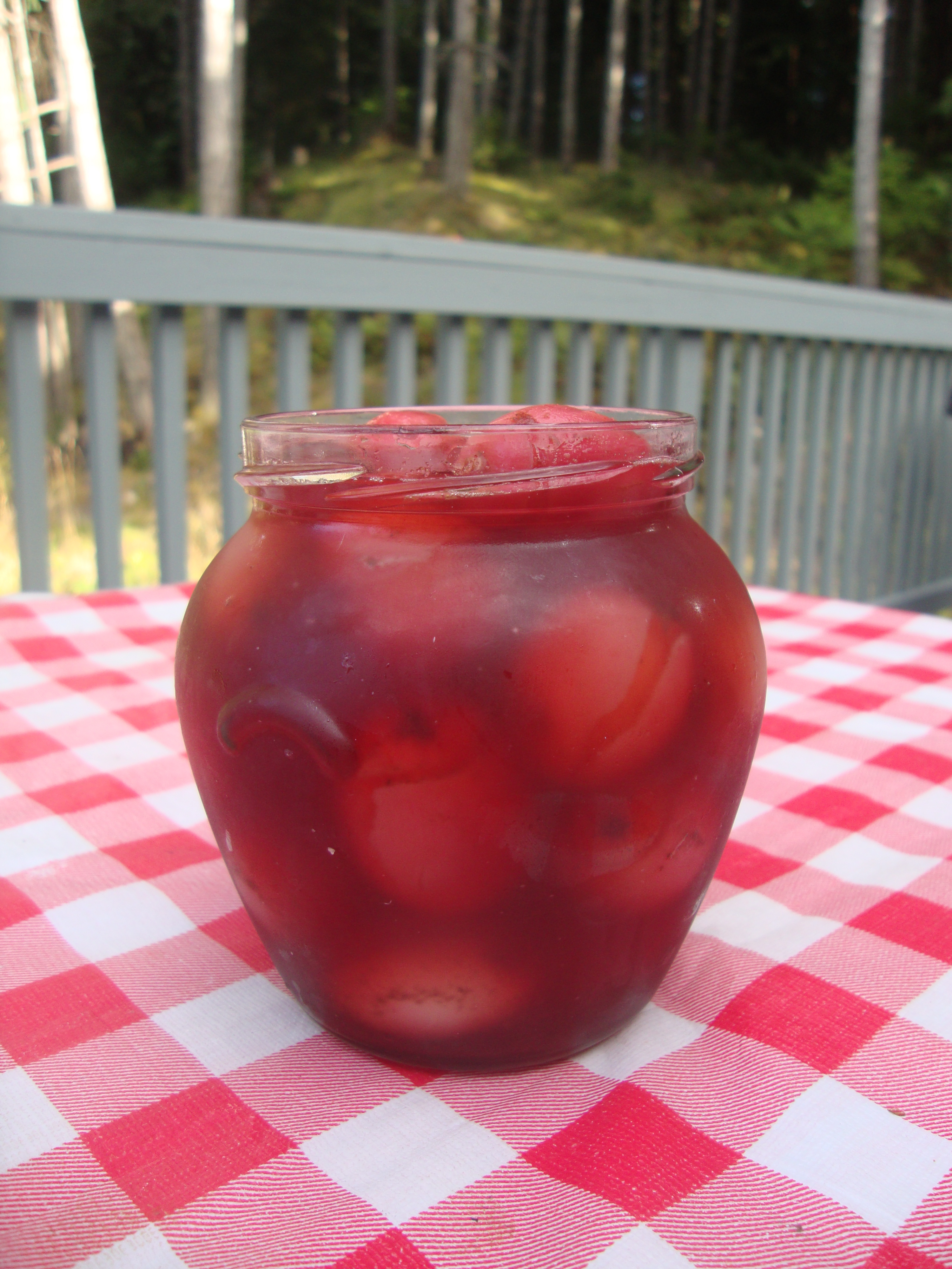 My Estonian grandmother planted a fruit tree for each of her grandchildren when they were born.  Mine was the crab apple tree.  When I was about seven years old, I asked my grandmother why my tree was the one with fruit that was so hard and sour.  She told me that the crab apple tree helped all of the other trees to produce more fruit.  When she explained this to me, I thought that my tree helped those around it through magic, like a good luck charm for the orchard.  The trees of my cousins and siblings made good tasting fruit, but mine was magic….so there.  I now understand that crab apple trees attract pollinators…so there.   My grandmother also pickled the sour crab apples and served them with ham on Christmas Eve.Crab Apples Pickled in Sherry Vinegar and five Spice PowderCrab apples did well on Gabriola Island this summer so I bought some to pickle.  Luckily, my Aunty Mona was visiting my mother also, and she knows how to cook EVERYTHING…well at least everything that I ever seem to be interested in learning how to make.  Mona knew how to pickle crab apples in the old style. It’s very easy, so if you have access to crab apples give it a try!  Mona and I decided to use sherry vinegar and five spice powder, because we had them on hand and….Oh my goodness!  I would go out of my way to get sherry vinegar and five spice powder again next time because the pickles turned out so tasty.  In addition to producing wonderful pickles to serve with meat or fish,  this recipe will provide you with a spiced, sweet vinegar that, combined with a splash of olive oil and a bit of salt, makes a marvelous salad dressing.  If you are someone who likes switchel, crab apple pickling liquid would be great in that too!