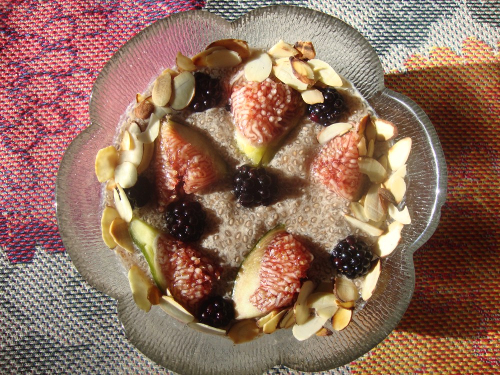 On vacation I had been enjoying chia pudding with the fresh figs and blackberries that are in season on Gabriola and in Vancouver. Actually the consistency of the chia seed pudding is a little bit like the inside of a very ripe fresh fig. Figs are nature’s pudding.