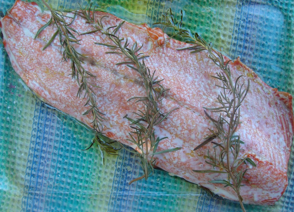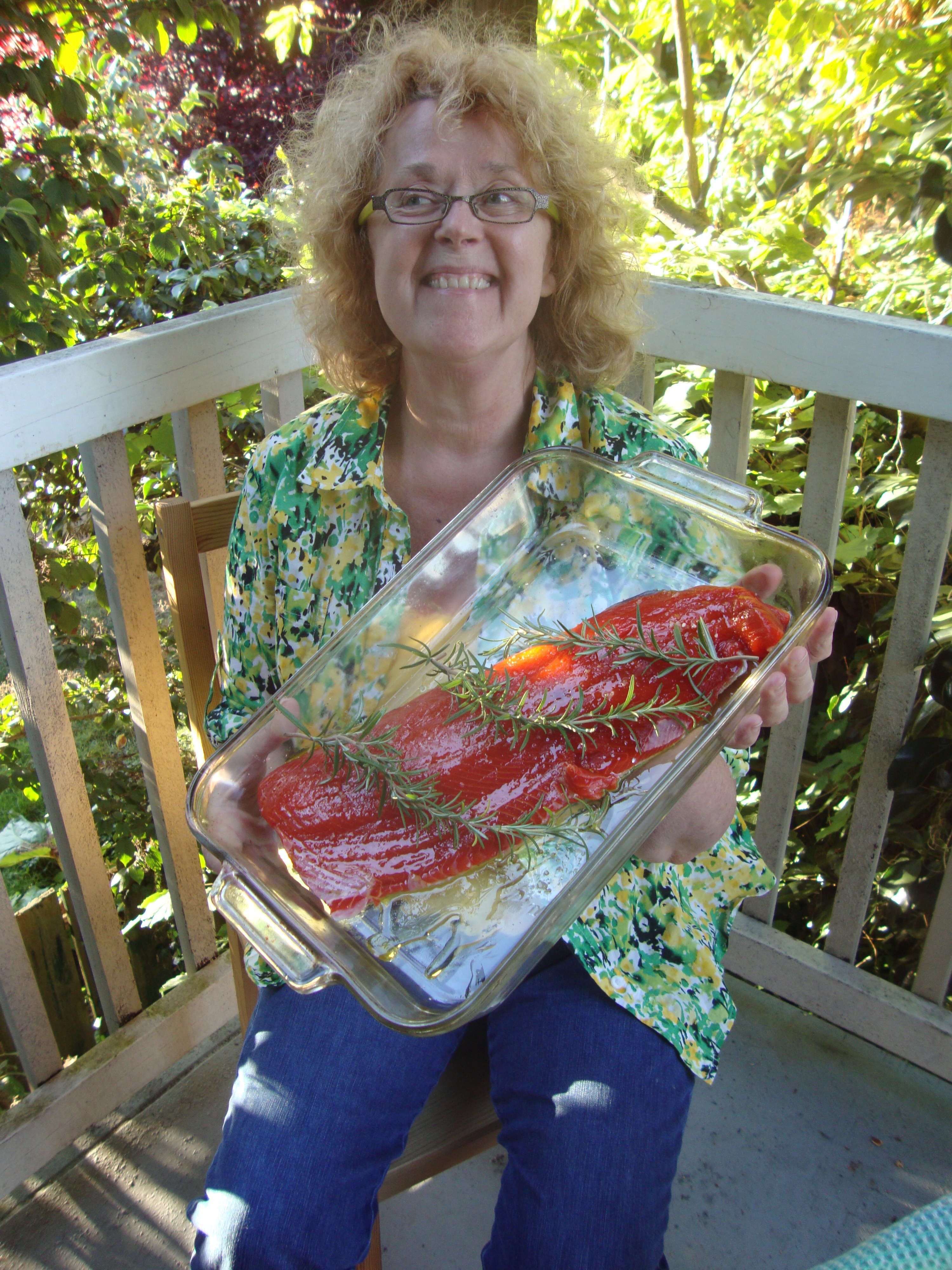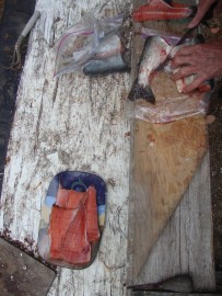My mother’s friend Keith, fisherman, boat builder , grower of figs and expert food forager extraordinaire, served us pink salmon that he had caught himself.  He has an outside preparation area for processing his fresh caught oysters and fish.