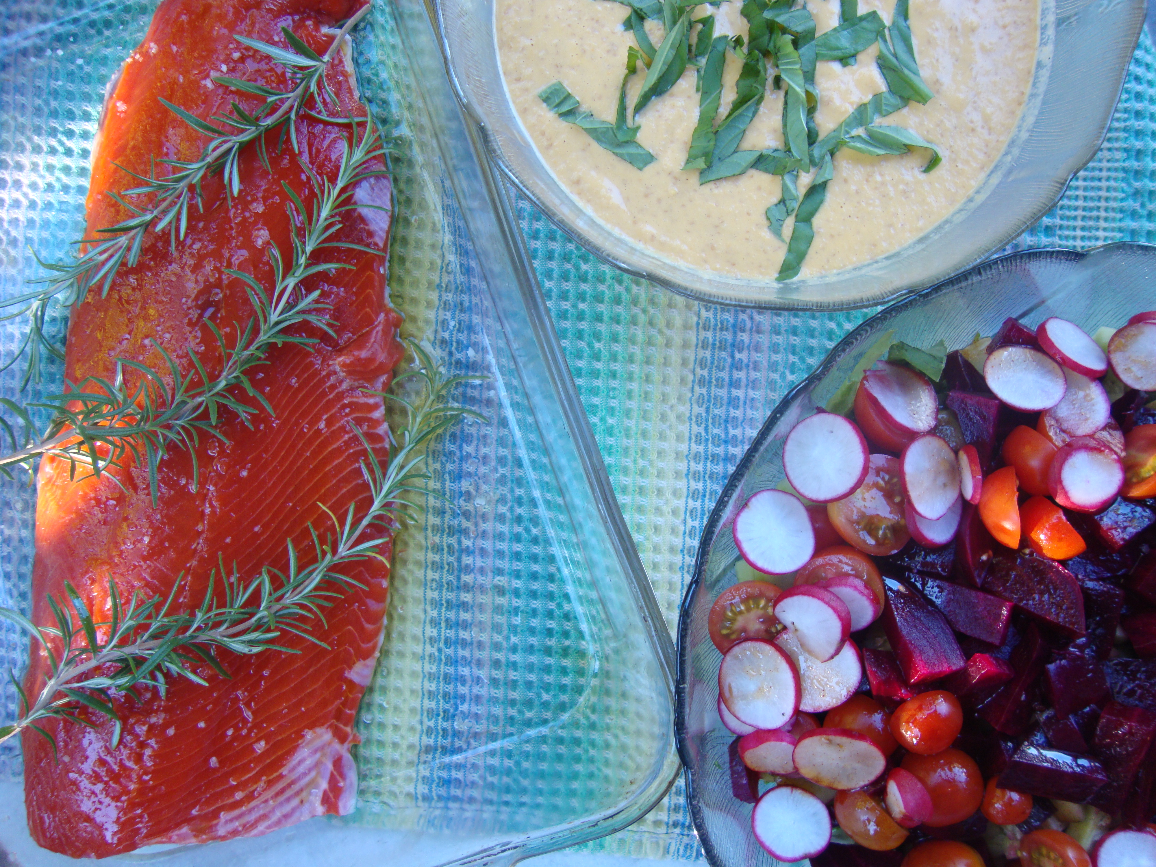 In Vancouver, I had dinner with my sister, Silvi, and her mama, Ieva, who lovingly prepared salmon on  Silvi’s request.  I was on the phone with Ieva making the dinner plans and Silvi gave me a serious, plaintive look and said “I want a salmon”.  Silvi’s look told me, “Don’t mess with the order of my existence by planning some weird dinner.  Late summer time + dinner with my mom = Salmon”.
