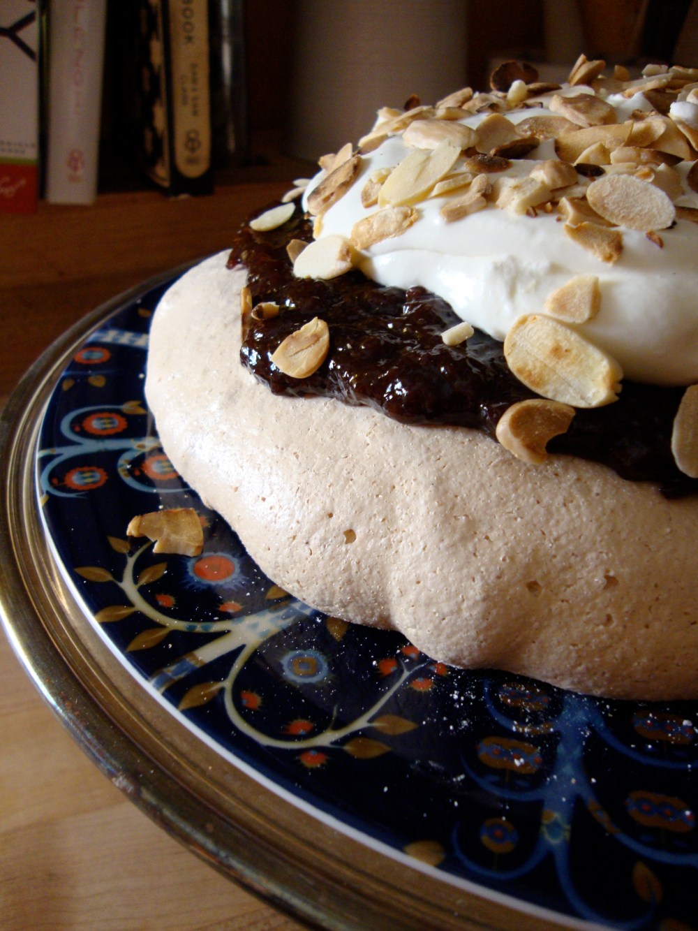 Pavlova was invented in honour of the ballerina of the same name by a chef from Australia or New Zealand.  The two countries seem to have an argument about that point.  The desert is fluffy and beautiful and delicate like a ballet costume with a lot of tulle on it.  It is a big fluffy pile of merigne that is baked and then topped with whipped creme and fresh fruit (or in this case plum preserves).  The simplicity of the basic desert lends itself well to any flavour combination that catches your fancy.