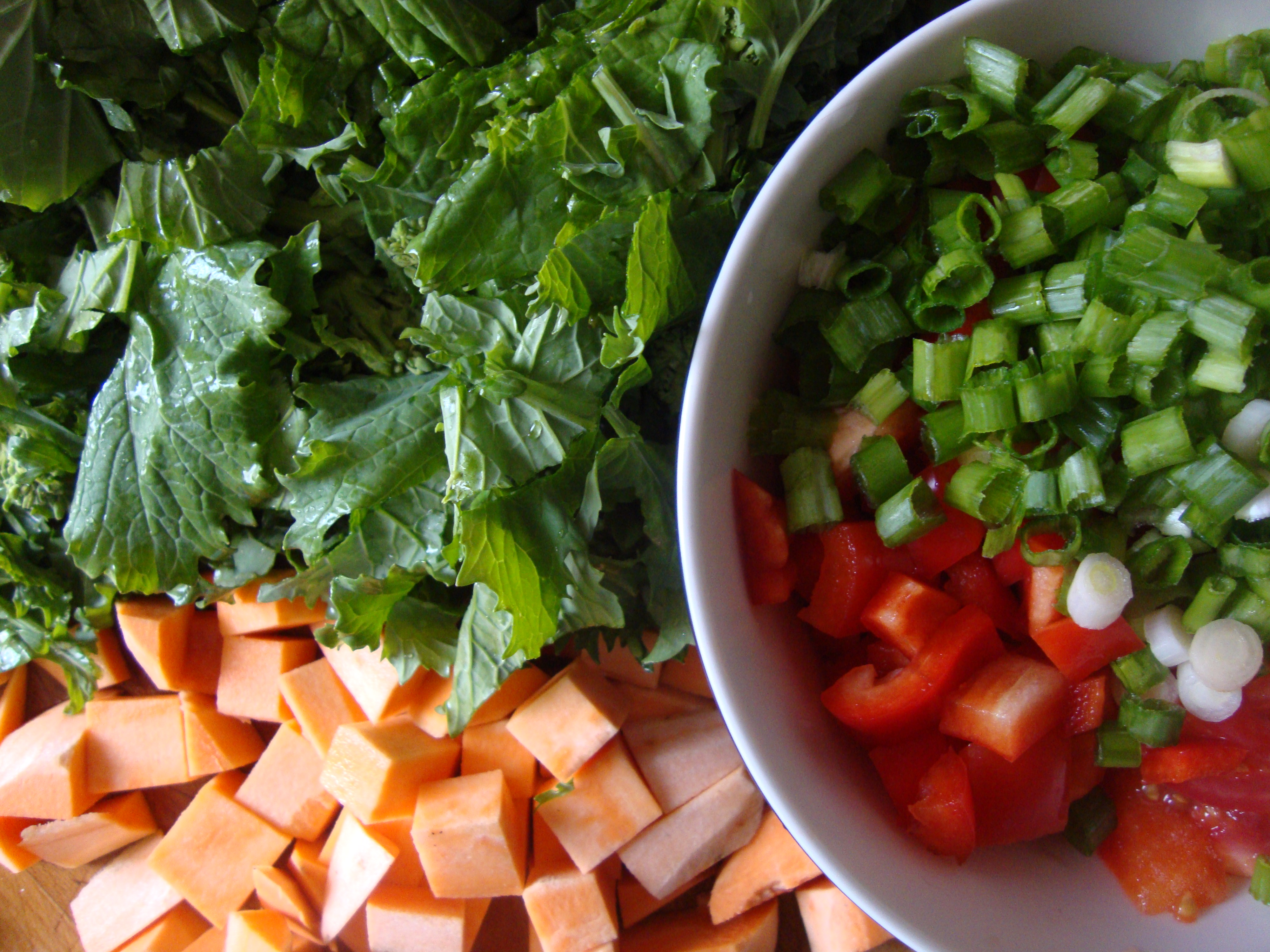 - Peel and dice the yam. Toss the pieces with some oil, salt and pepper on a baking sheet and roast the yams while you prepare the greens.