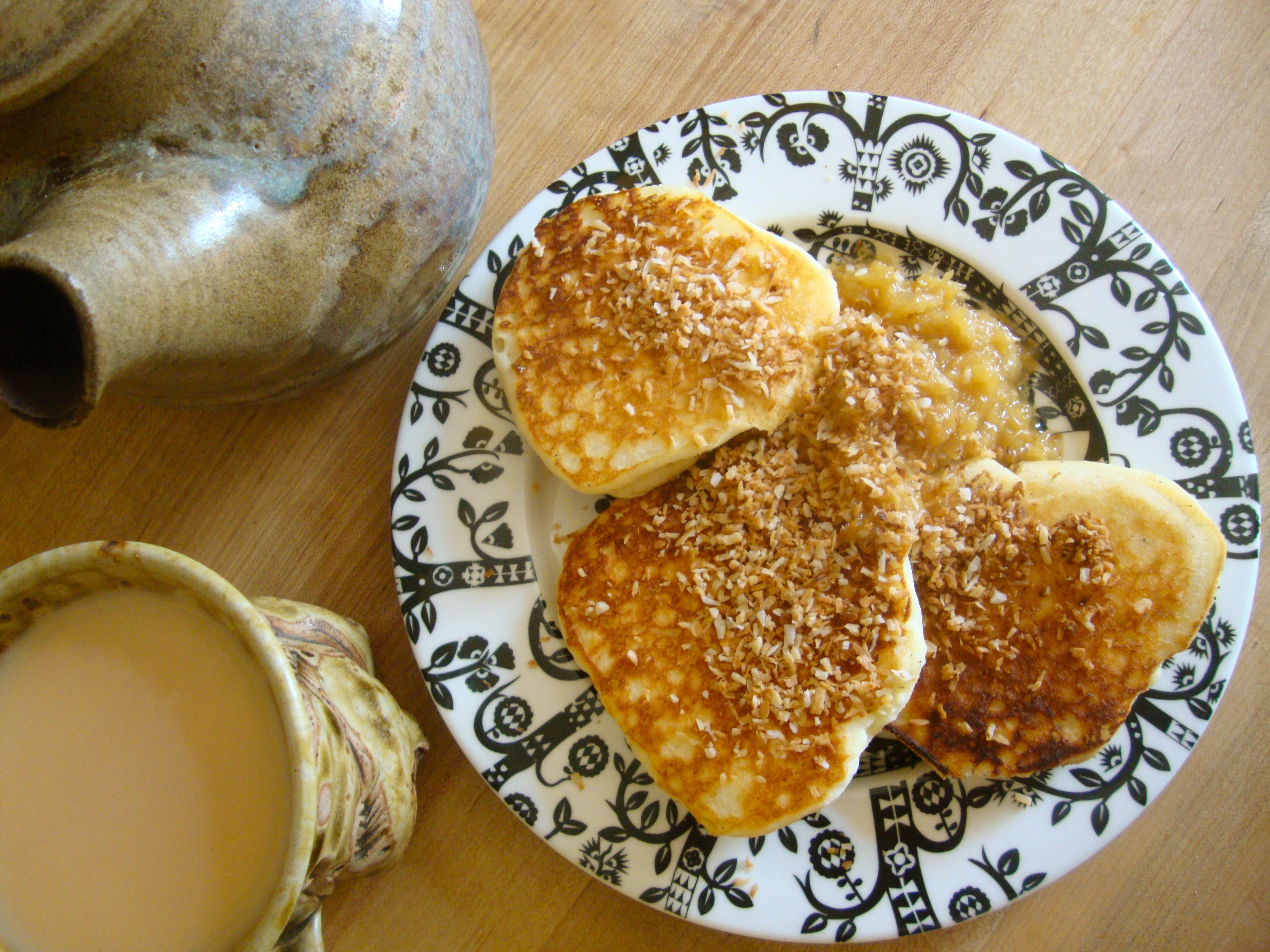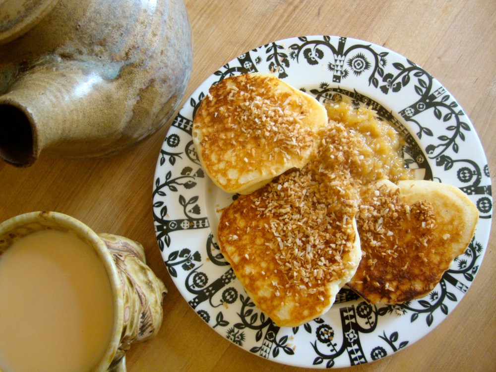 I had forgotten about the pleasures of this delicious, low-brow pancake topping until I recently had some leftover canned crushed pineapple from making a gluten-free carrot cake. It is just as good as I remembered. It might even be better now that I make coconut pancakes! This breakfast makes me feel like I am on a tropical vacation and eating brunch at a hotel restaurant on the beach, which is a nice fantasy if you are in fact eating breakfast in the dim winter morning light of your Brooklyn kitchen.