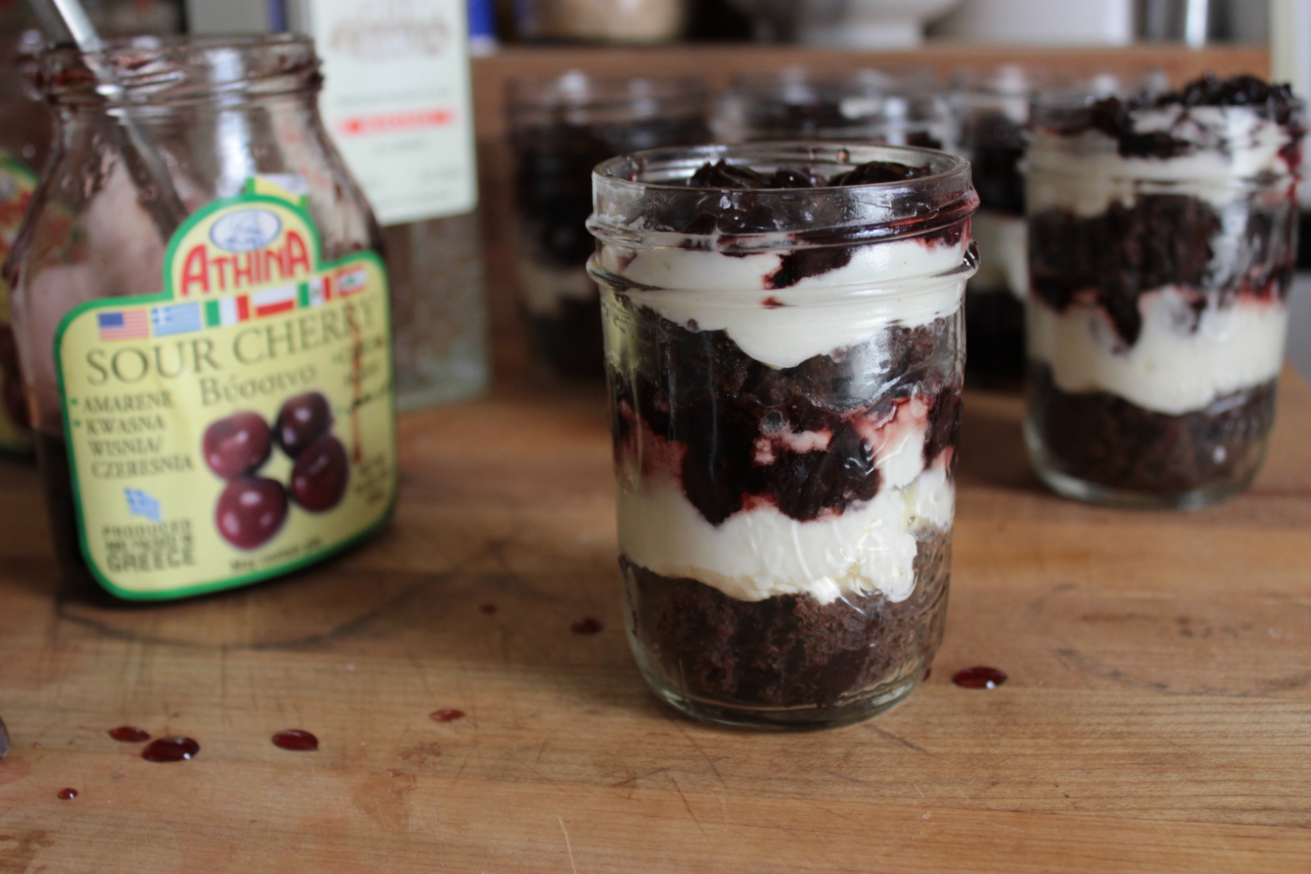 My husband suggested that it might do better as a trifle and right he is.  All of the sinister power of a sloppy black forest cake has been contained here in half pint mason jars, but little brandy glasses would probably be nice too.  Just a warning, this treat is a bit much after a full and satisfying meal.  This is a whole lot of  dessert…it is a meal of sweetness unto itself.  I say eat it in the afternoon on an empty stomach with nothing but coffee or tea, enjoy bouncing around on a sugar high for a while and then take a nap.  I took these trifles to a dinner party, where they should have gotten another dollop of whipped cream and shavings of dark chocolate…but I ran out of cream.   I used sour cherries in syrup that I get from the greek grocery store.  These are commonly available in Eastern European and Baltic specialty food shops and they are delicious.  If my birthday was in August, rather than March, I would get fresh sour cherries and toss them with a bit of sugar.  I would also celebrate my birthday at the beach with mid-day cocktails but some us have birthdays right in the last cruel gasp of winter and we are allowed to buy sour cherries in syrup from whatever fancy European shop we feel like.  So there, all you Leos!