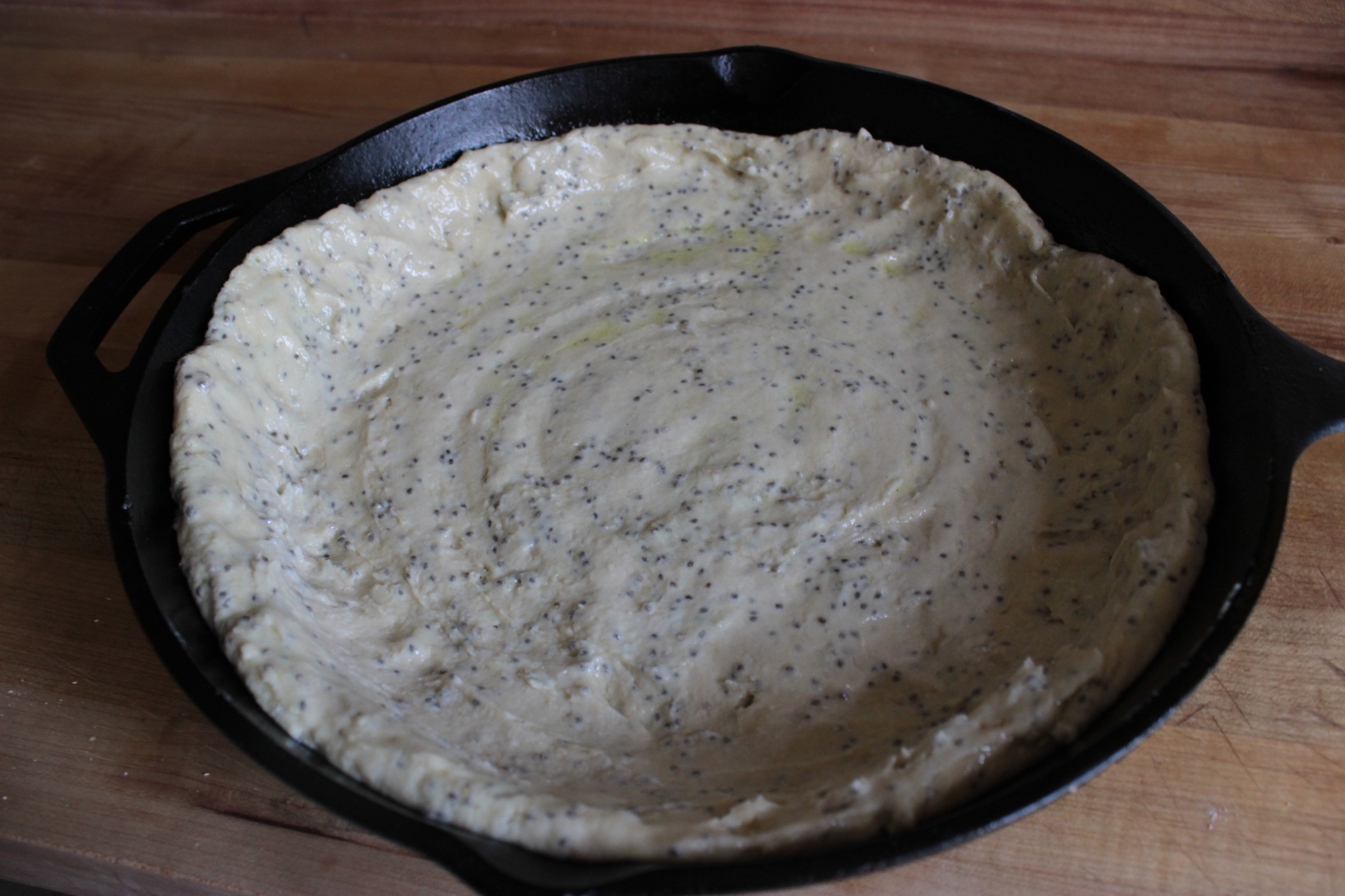 - Dump the dough into the center of the cast iron pan. Using oiled hands, flatten the dough with a circular motion starting in the center, until it reaches the very edges of the pan. The dough is too loose to form a rolled edge on the crust, but you can use you circular motion to make the center as flat as possible without touching the edges, so that they remain a bit higher.