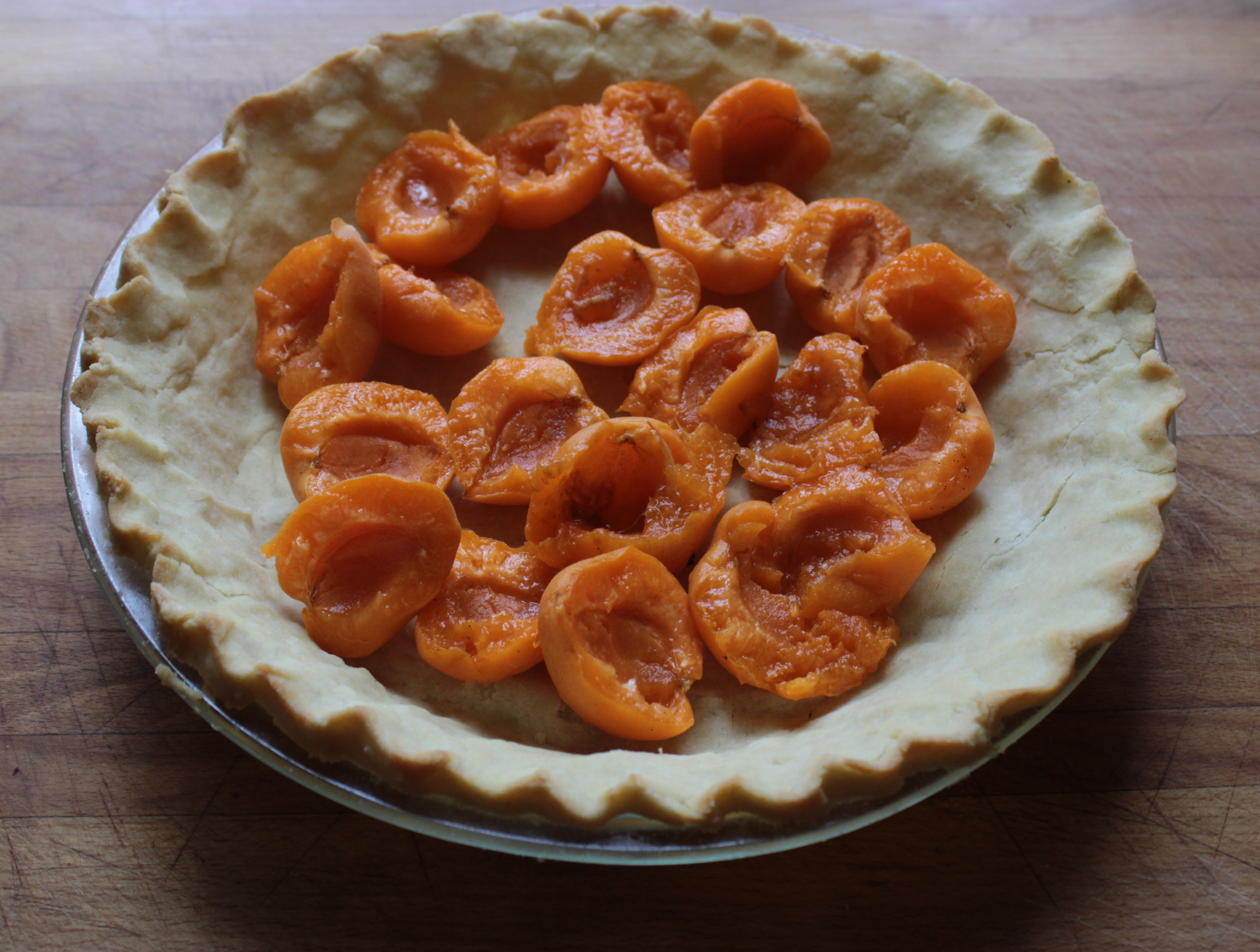 - Halve the apricots and remove the pits. Place them in the pre-baked pie crust.
