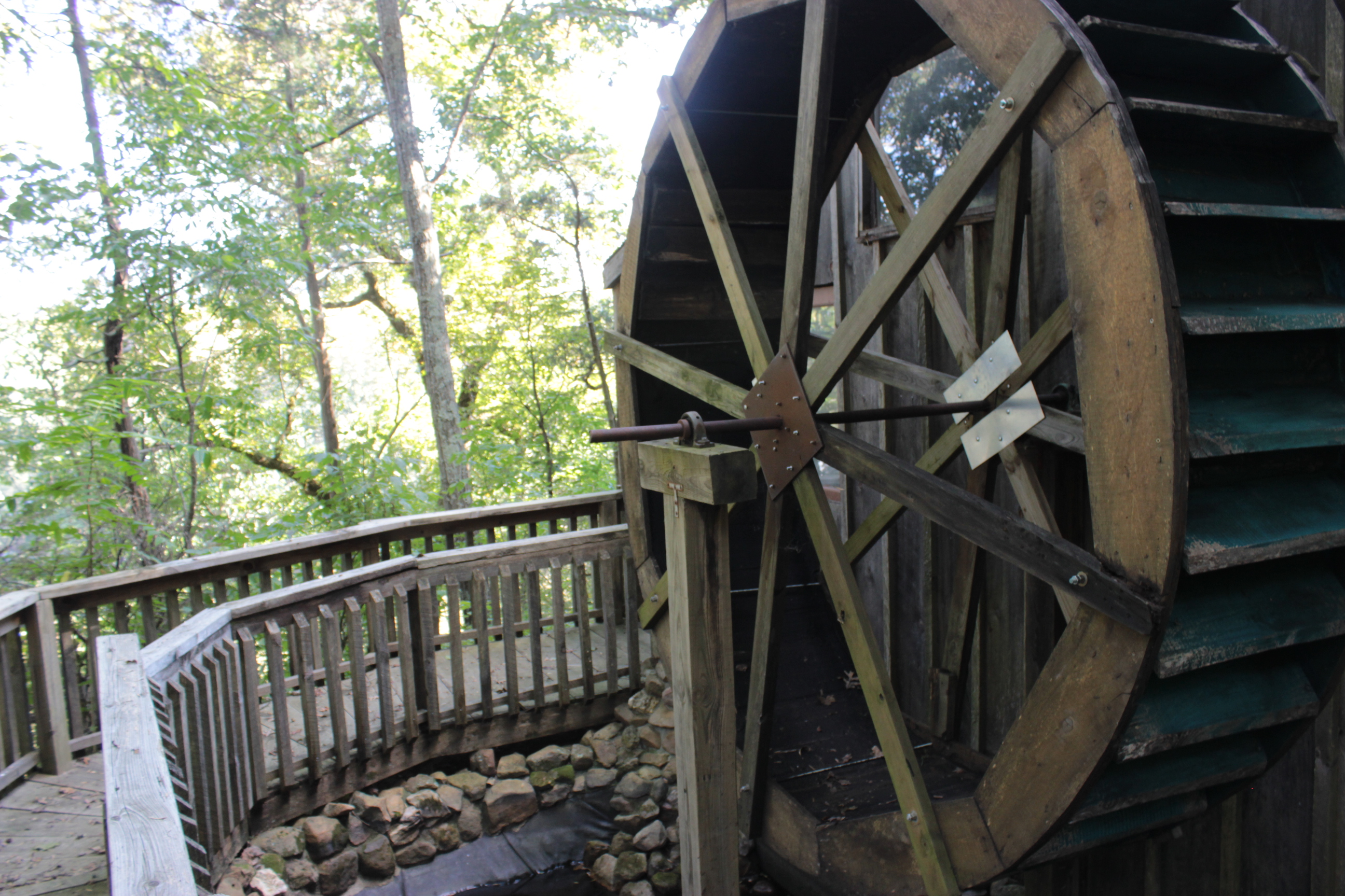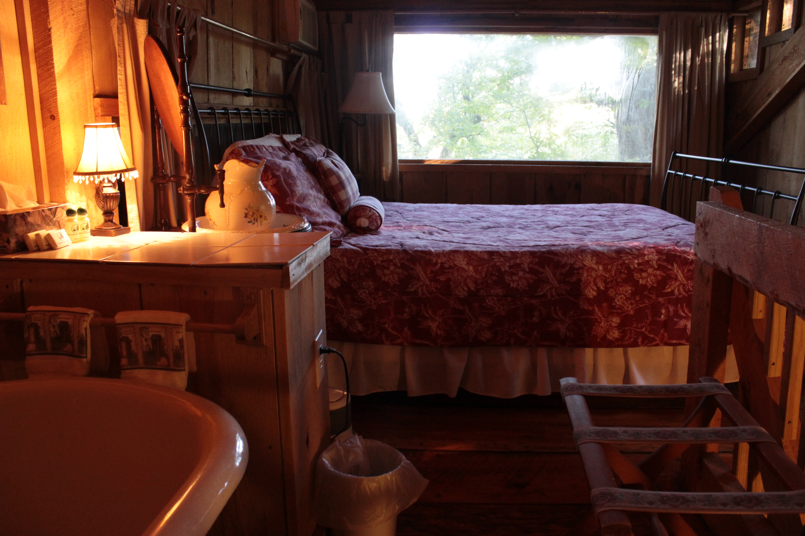 So!  After our camping trip, we scooted down the road to Nolichucky Bluffs B and B.  We would go back again (even if we didn’t need a bath) because it was terrific.  They have many well-appointed cabins, all right on the beautiful Nolichucky river.  We chose to stay in the loft at the Grist Mill.  This is a fully operational grist mill with a tiny, cozy sitting area and a loft that features a claw foot tub and nice comfy bed.  There is a big picture window that looks out into tree tops and over the river and also a window behind the bed that looks down into the mill itself.  The rest of the bathroom is in an “outhouse” but it has running water and light.  It also has a porch overlooking the river.  It is a comfortable, cozy and quirky spot.