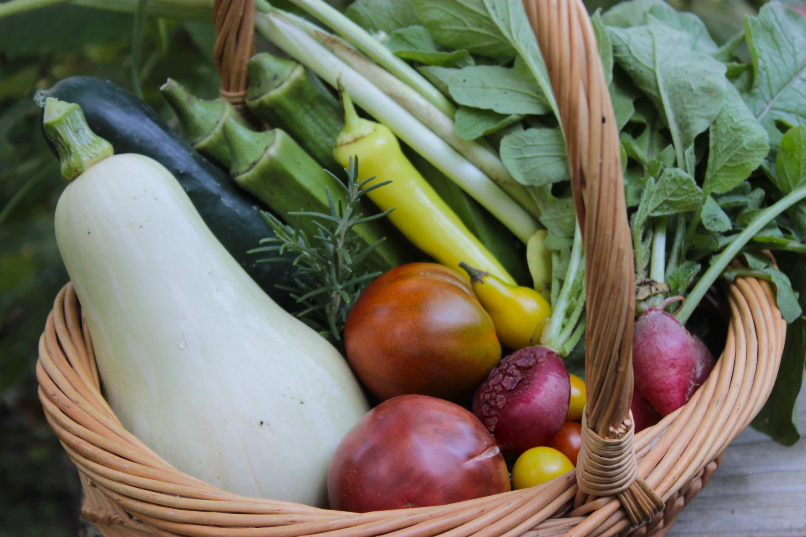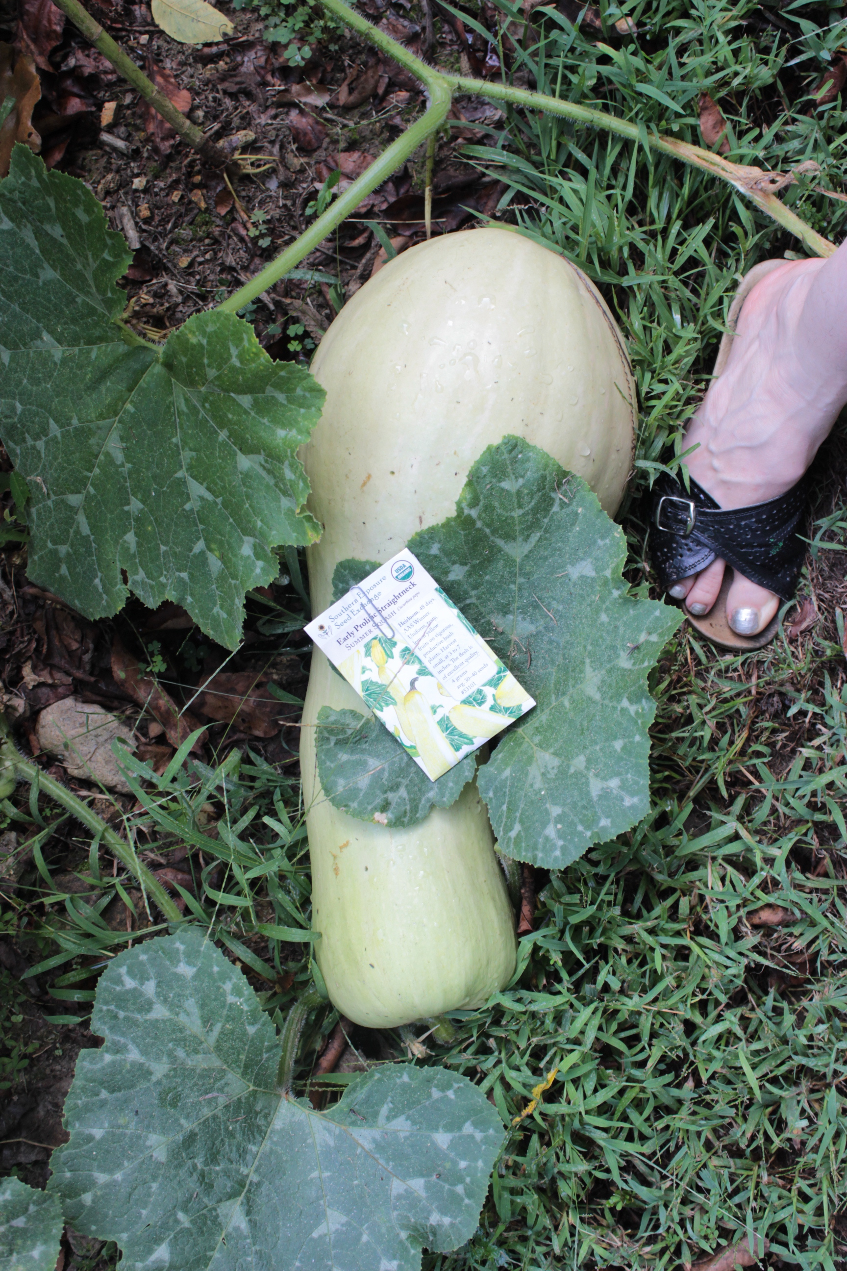 IMG_4279In addition to the cabins and the grist mill and the glass chapel, there is an organic farm on the property!  You can purchase a beautiful basket of homegrown, organic seasonal vegetables.  The other cabins have full kitchens, but the grist mill has only a fridge and microwave.  I was prepared to break out the camp stove, but the lovely proprietress, Pam, let us use the beautiful  kitchen where she prepares breakfasts for the guests.  We had a wonderful time visiting with her.IMG_4249As you can see, our basket included okra, tomatoes, peppers, radishes, cucumber, green onions, rosemary and a MYSTERIOUS SQUASH.  The mysterious squash was very pale green (almost white) and looked otherwise like a small butternut.  I was excited to see this squash, because my mother-in-law had the same mysterious squash growing in her yard.  She said that she had planted Early Prolific Yellow Summer Squash (You know, the ones that are like little yellow zucchini).   However, the plants that grew did not produce early, nor were they prolific.  Instead, she was alarmed to discover that it the plants suddenly produced three enormous, pale green squashes in the fall!  (Dramatic music here).