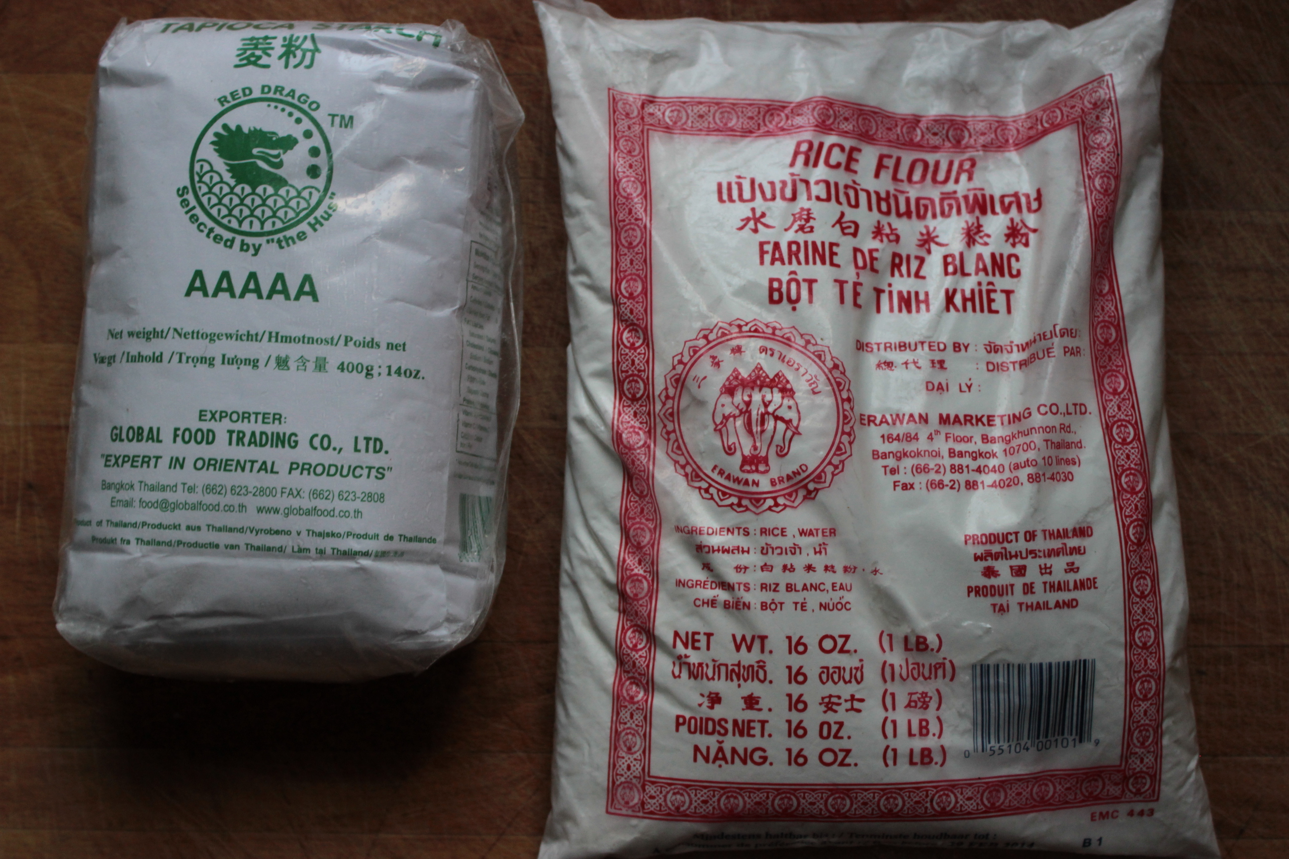 I took a screen shot of the 2 flours pictured to my local Asian market an bought the exact same flours. I appreciated the ease of no measuring as the tapioca flour comes in a 14 oz bag & the rice flour comes in a 16 oz bag. Dumped both bags right in the KA mixing bowl.