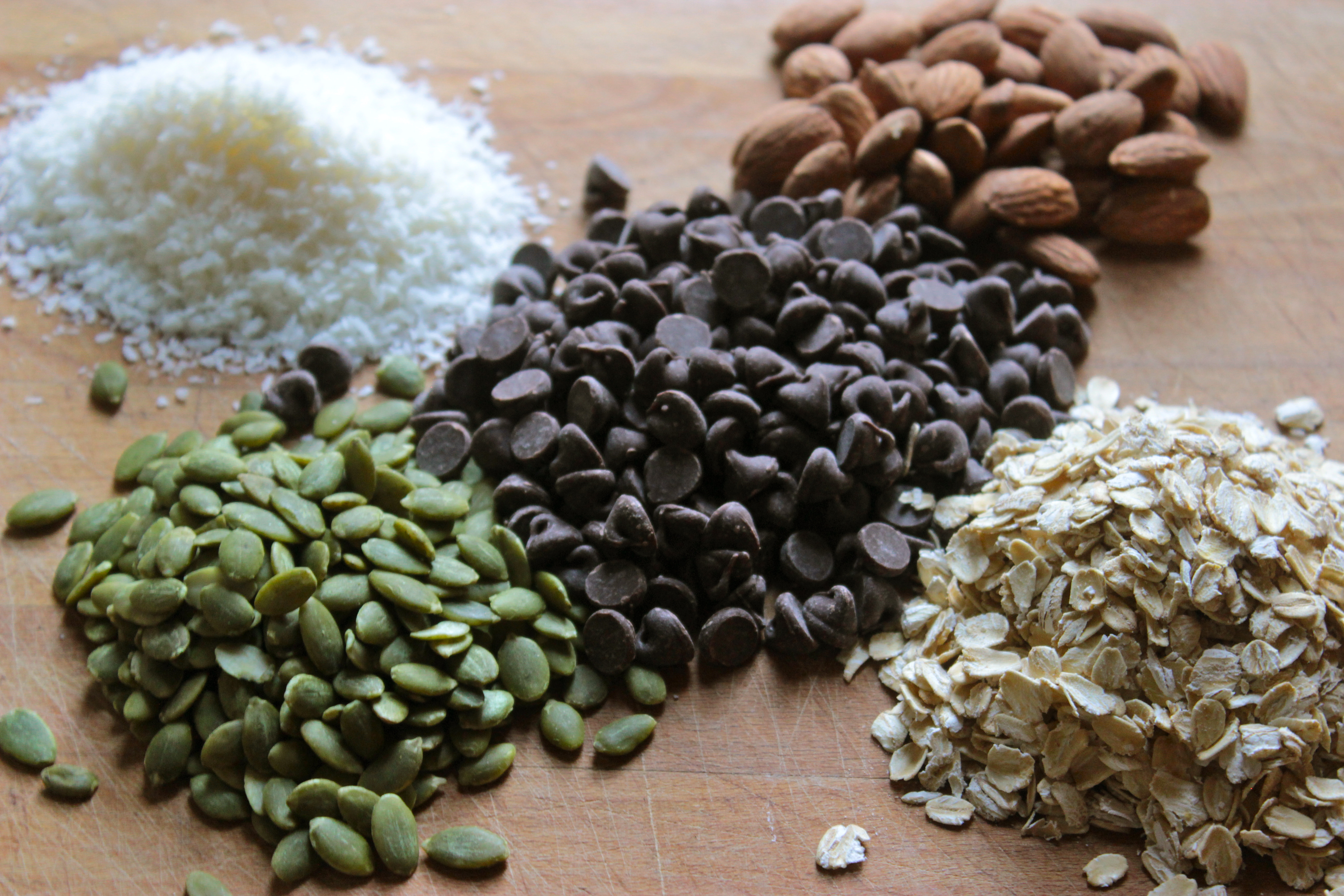 - Stir in the oats, coconut, chopped almonds, pepita and chocolate chips.