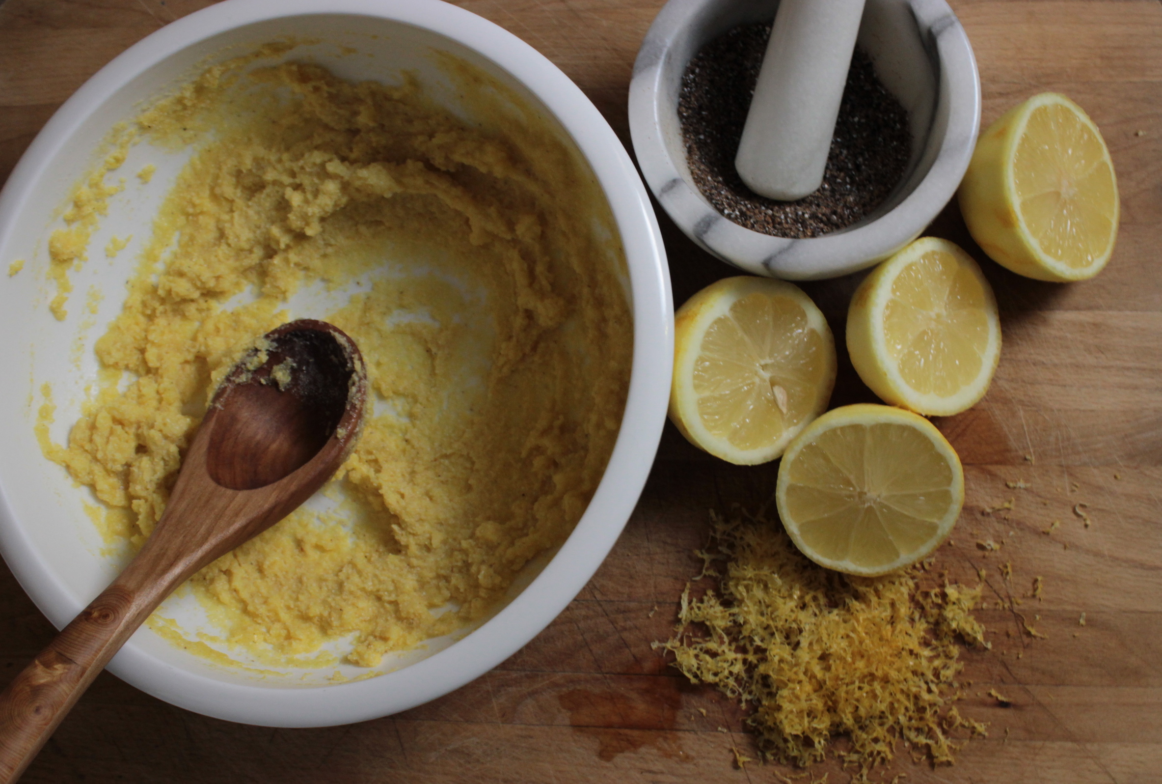 6. Stir in the remaining 3/4 cup of corn meal, baking powder, all but 1 tablespoon lemon zest, the lemon juice and all but 1 teaspoon of the cardamom.