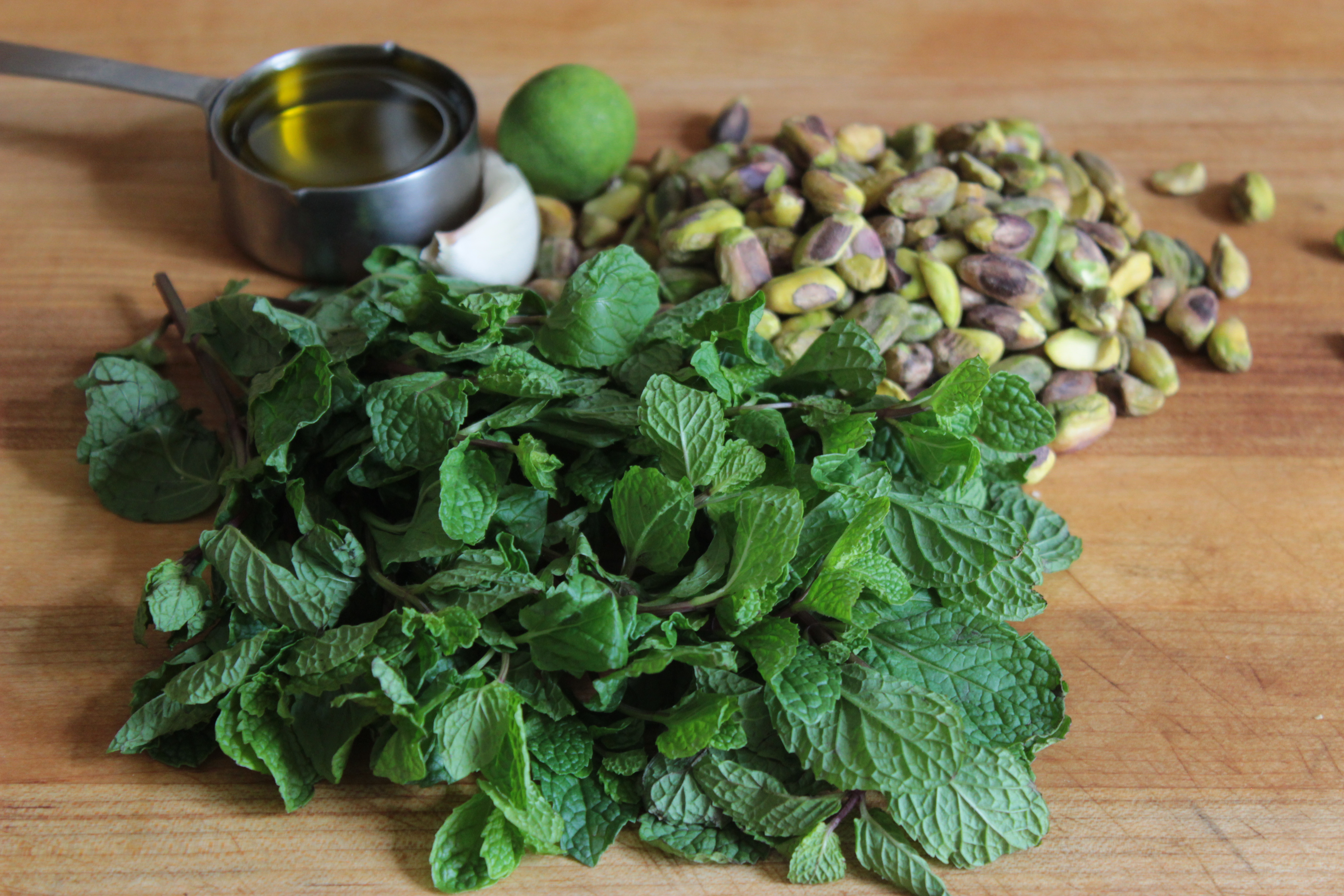 In celebration of tender green things and the spring time, I like to make pesto. Also, I tend to be very busy in the Spring and pesto is a fast way to add a homemade touch to quick food. I am not actually a big fan of the classic basil and pine nut pesto. I like to make weird pestos, usually to use up the last bits of some herb or leafy thing left over from another recipe. Last spring I posted recipes for dandelion/ hazelnut, lemony kale, cilantro/sunflower and romaine pestos. This year, I offer you mint/pistachio, pea shoot/almond, cilantro/pepita and nettle/ramp pestos for your enjoyment!