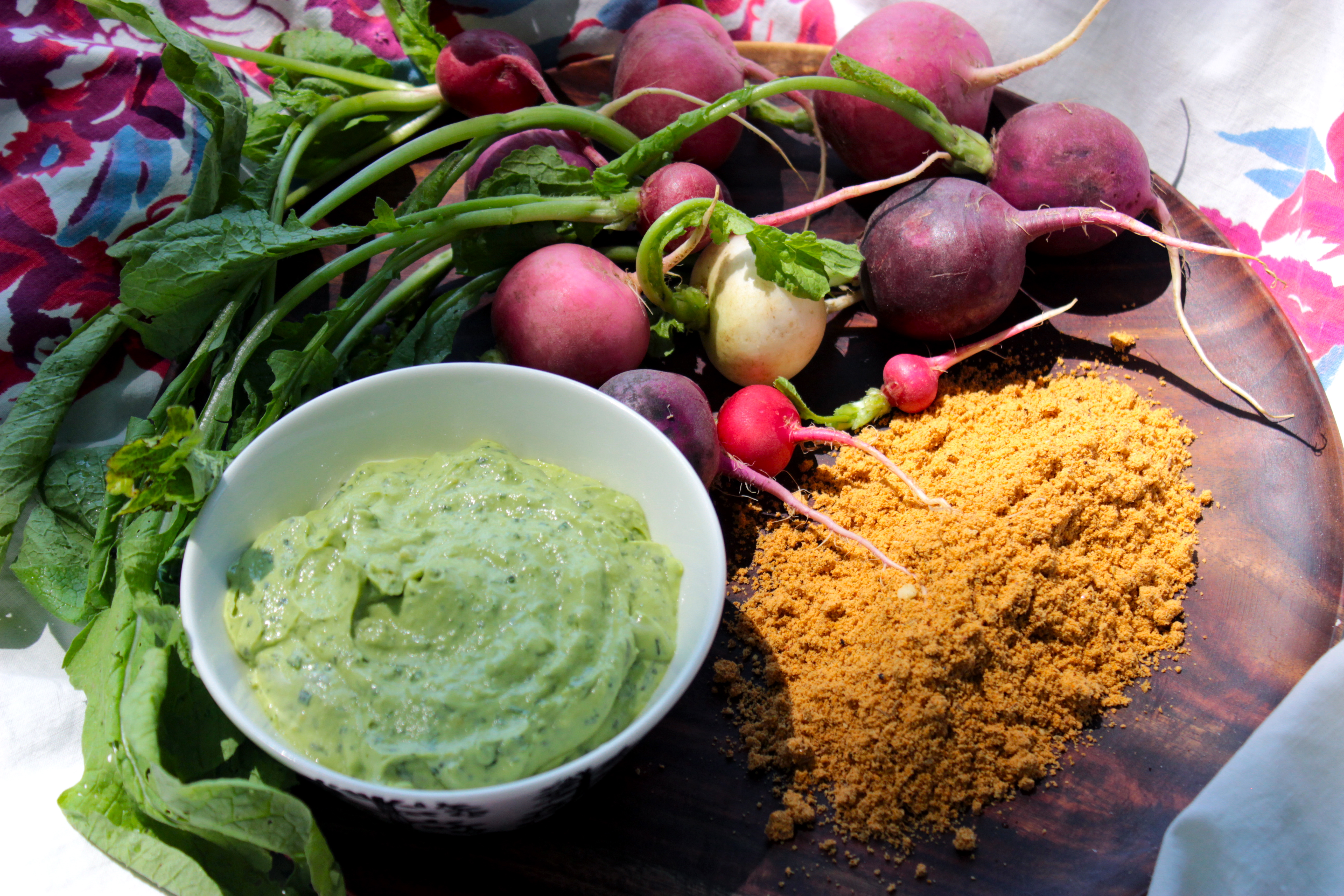 Radish Snack with Avocado Crema and Spicy Pepita PowderI love radishes.  It is odd that I have not talked about more on this blog.  I guess that  I don’t actually cook with radishes.  I just eat them as a snack with olives, salted nuts or cheese….and add them to every salad I make…and sprinkle them, minced on top of my eggs.  Really, I eat radishes just about every day.  Radishes and swiss chard. I know that I have made some fuss about how hard it was for me to give up wheat, but if you wanted to see me have a total breakdown you could tell me that I was no longer allowed to eat radishes and swiss chard.Radish Snack with Avocado Crema and Spicy Pepita Powder