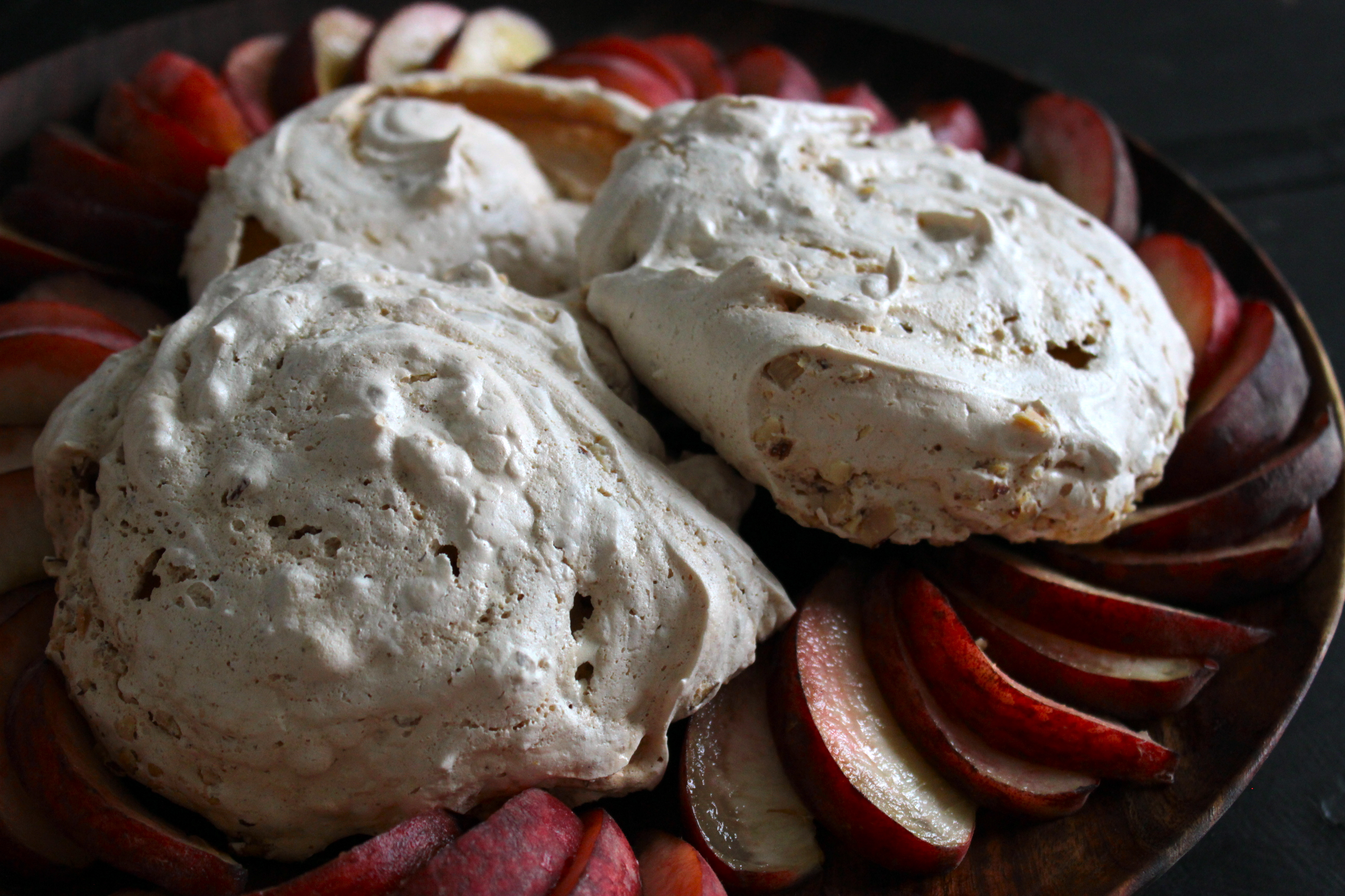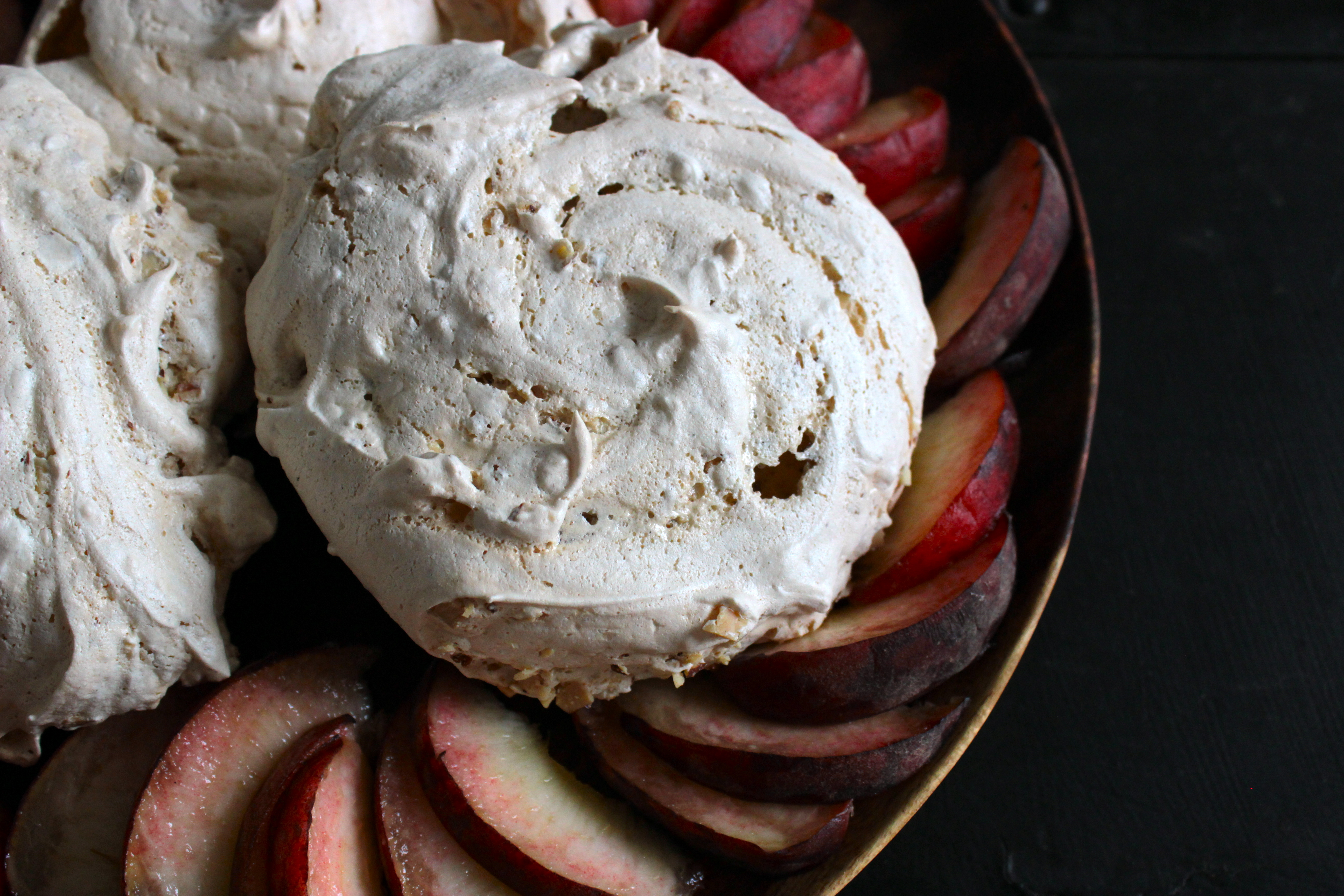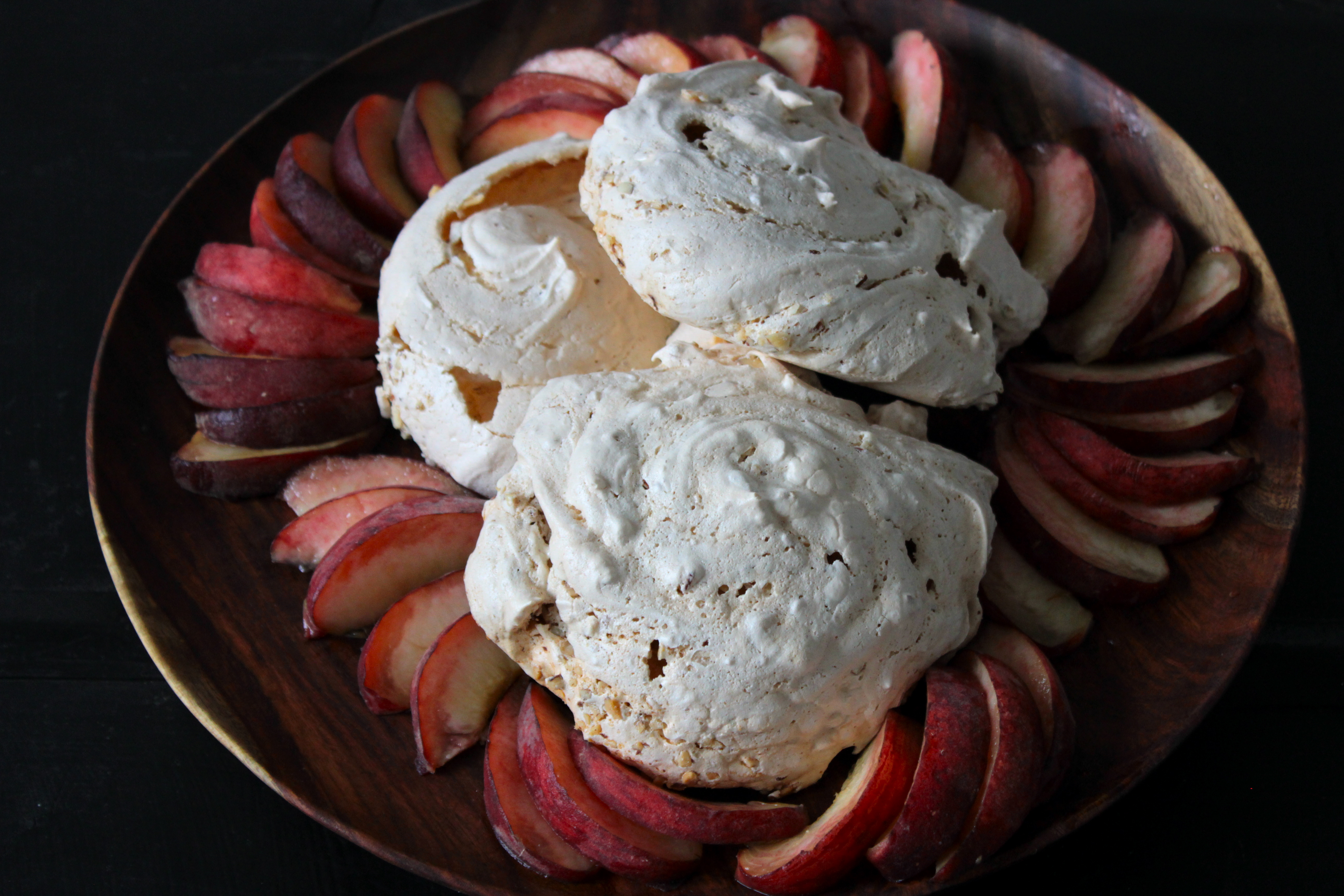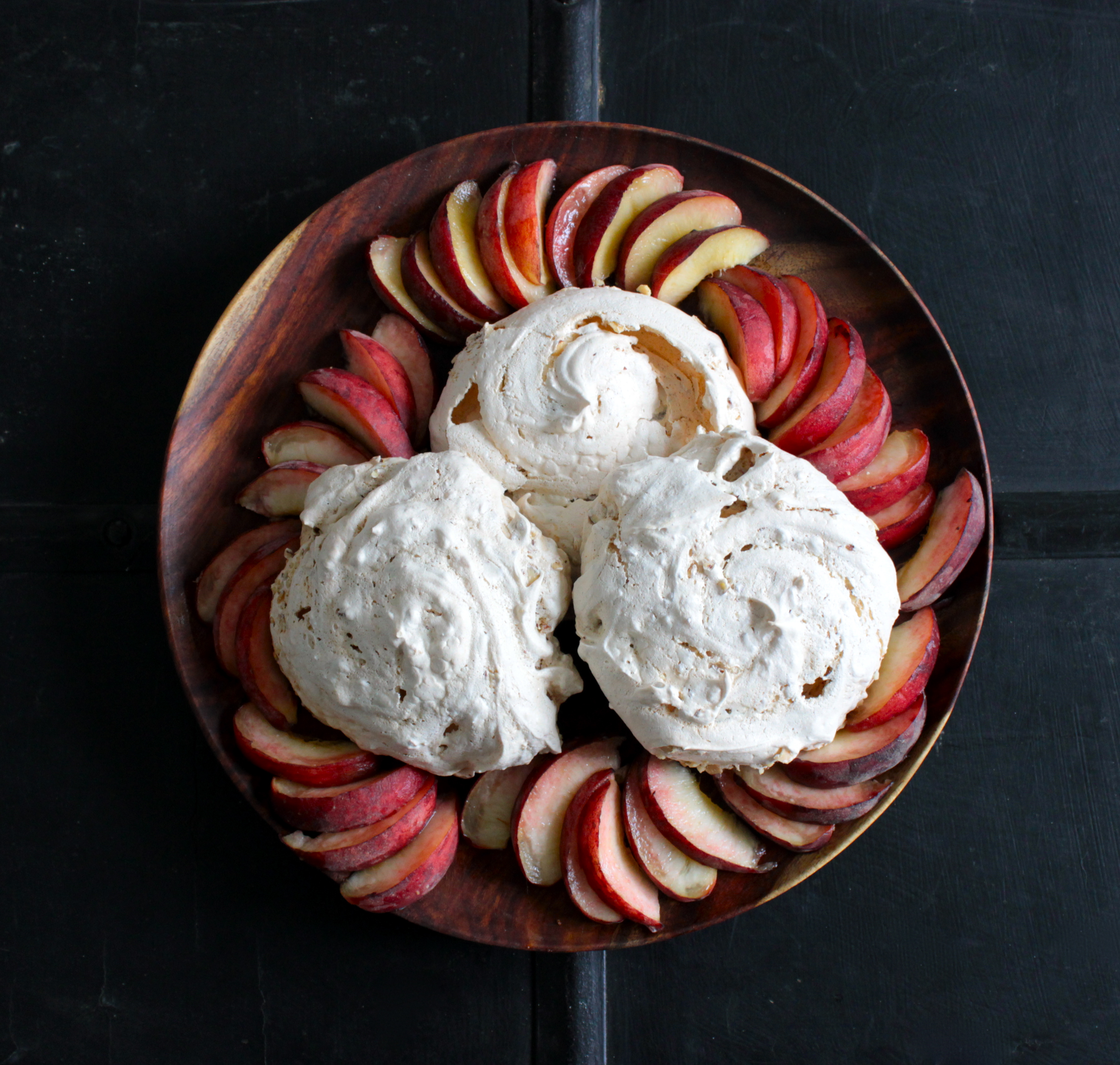 Okay, while we are on the topic of simple desserts to make with local, seasonal stone fruit, here’s a good one. The combination of juicy fresh peaches and cloud like, nut studded meringues really works. Sometimes meringues fail to puff up when it is humid. It does not matter. Dense chewy meringues are just as good in this case. I took this dessert to a dinner party this weekend and then I made another batch to photograph today. It is very dangerous to make batch all by yourself! I cannot stop eating them!