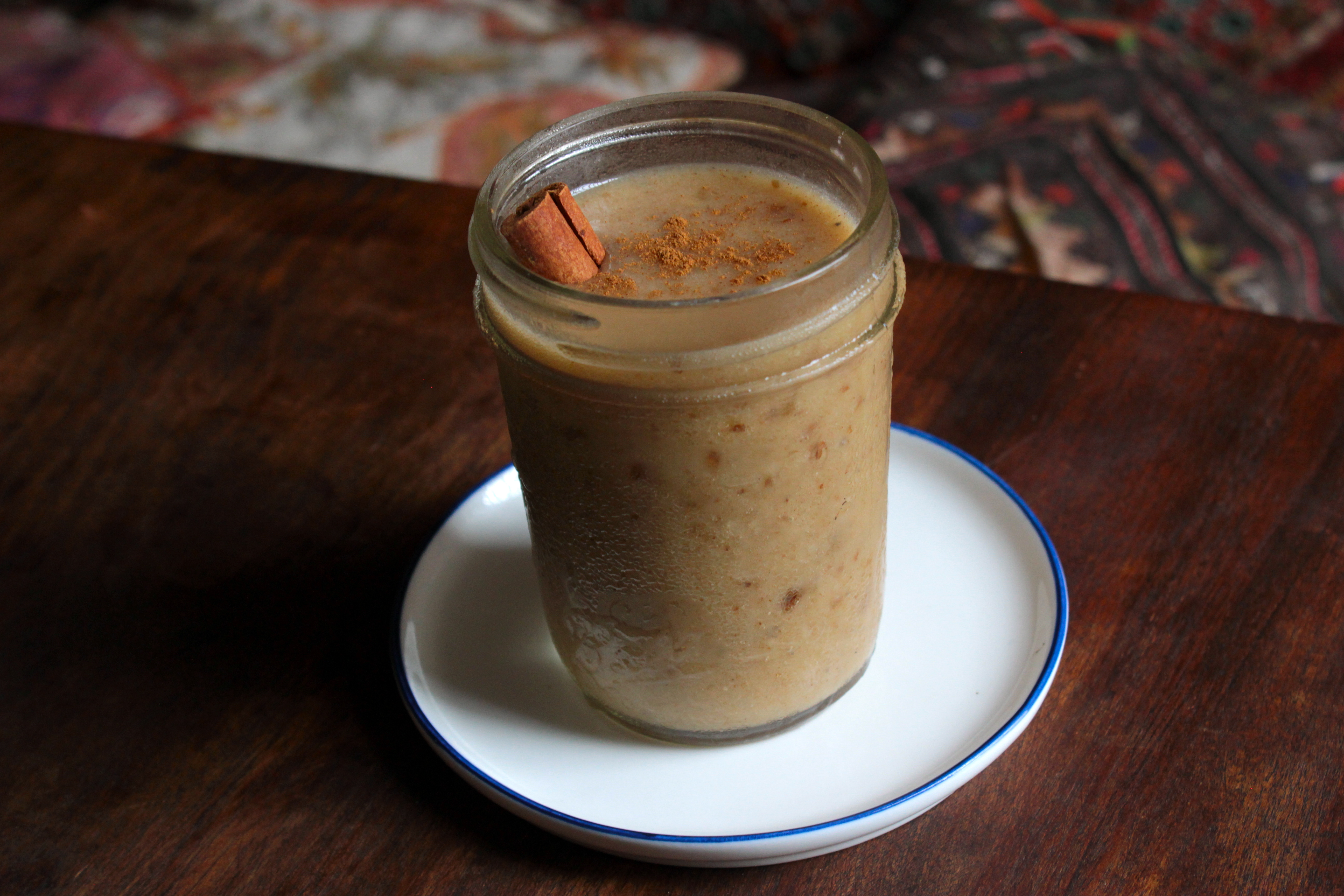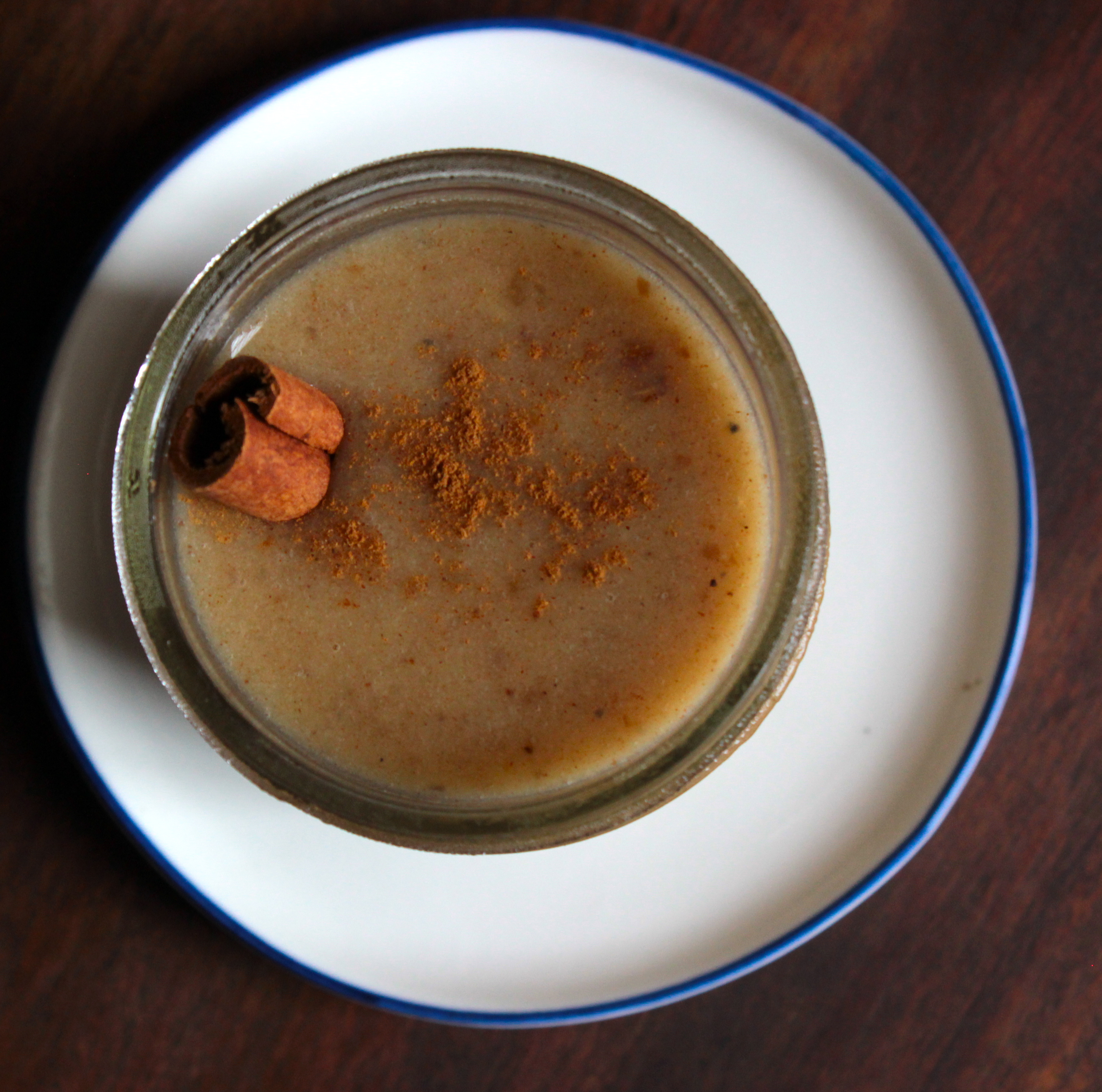 Put two glasses in the freezer. If you have a good old fashioned blender, you can toss all of this stuff in and blend it until smooth. I have an immersion blender which can be attached to a small chamber. If you are in the same boat as me, I recommend blending the bananas and dates until the mixture is smooth. Add the ice and process until it is crushed. Finally add the milks and the aromatics and blend it until it is smooth. Serve it chilled in the glasses from the freezer.