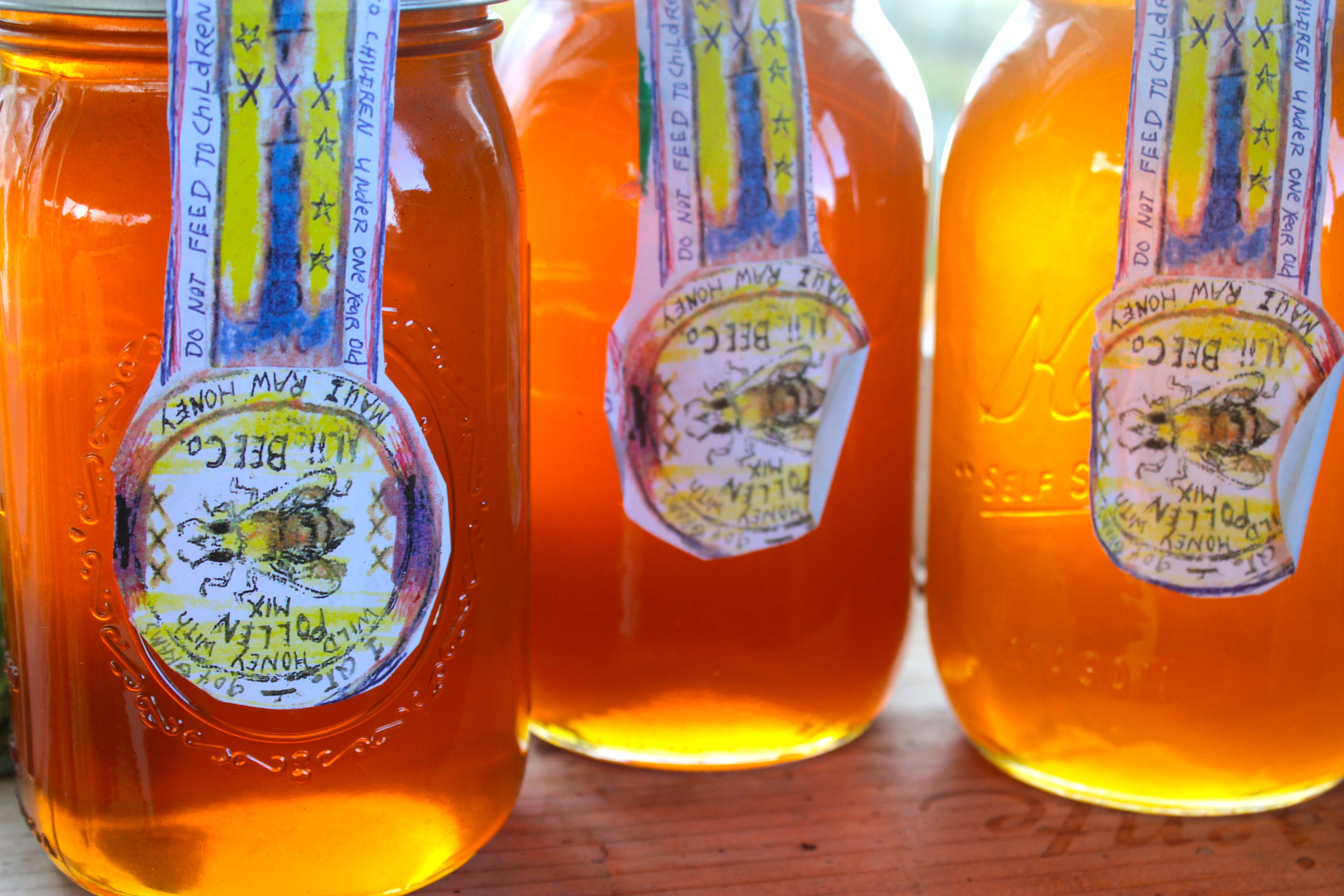 This honey is taken from wild bees.  The man who collects it is a bee whisperer.  He’s the guy you call if a swarm of bees has taken up residence on your porch.  He relocates the swarm and collects their honey.  On the top label you will find the area of the island that particular batch of honey came from.  At Christmas I scored a few bottles from Olinda, area up on the mountain with a big grove of Eucalyptus trees.  Eucalyptus honey is very good in case you are wondering.  The labels are drawn by the bee whisperers grandchildren.  C’mon now.  The honey is sometimes sold at the Upcountry Farmers Market  and also at Kula Country Farms.