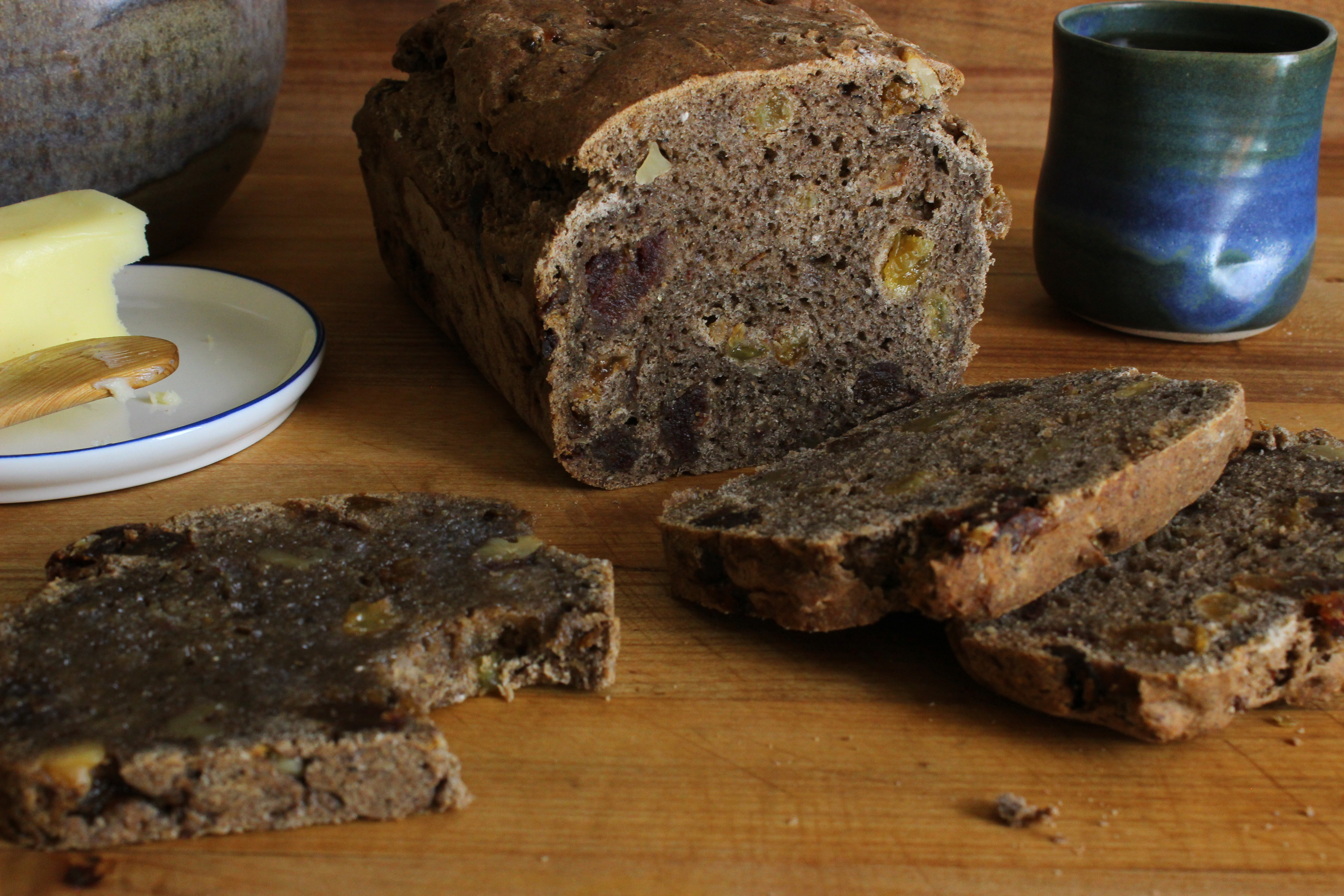 This is a chewy, yeasted bread. It’s not sweet, although it is perfumed with cardamom and studded with walnuts, dates and raisins. It’s best toasted and slathered with salted butter. I like it for breakfast, tea or with afternoon coffee when my husband is kind enough to make me some (I make terrible coffee). It would be a nice bread to make for Easter. My Estonian grandmother made braided cardamom bread for holidays.