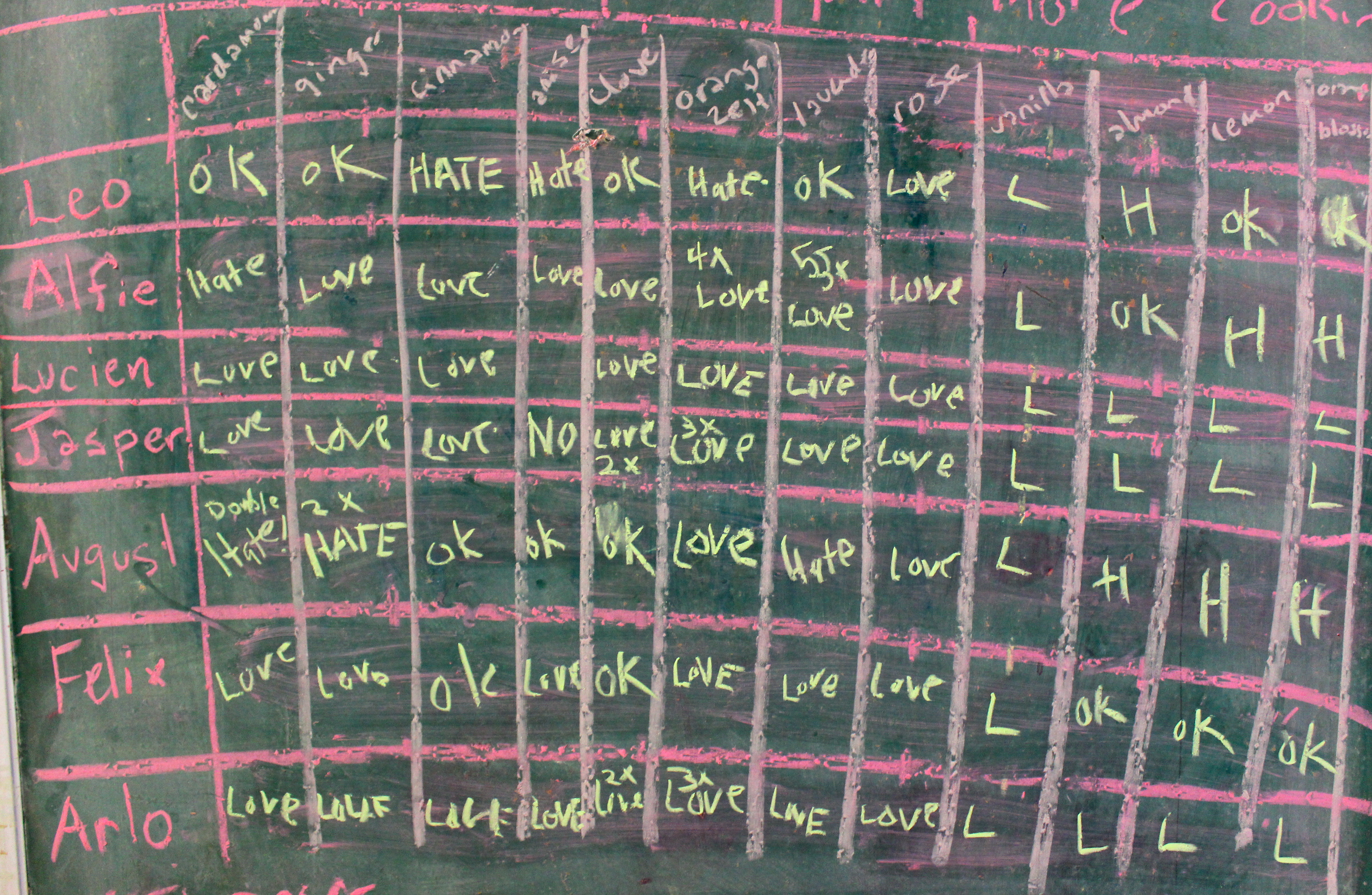 IMG_6764In the afternoon, I had the kids smell about 12 different baking spices and aromatic essences and we charted which ones they liked. Based on their preferences, we came up with three flavours of meringues.
