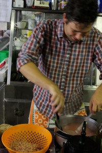 Noah strains the pasta