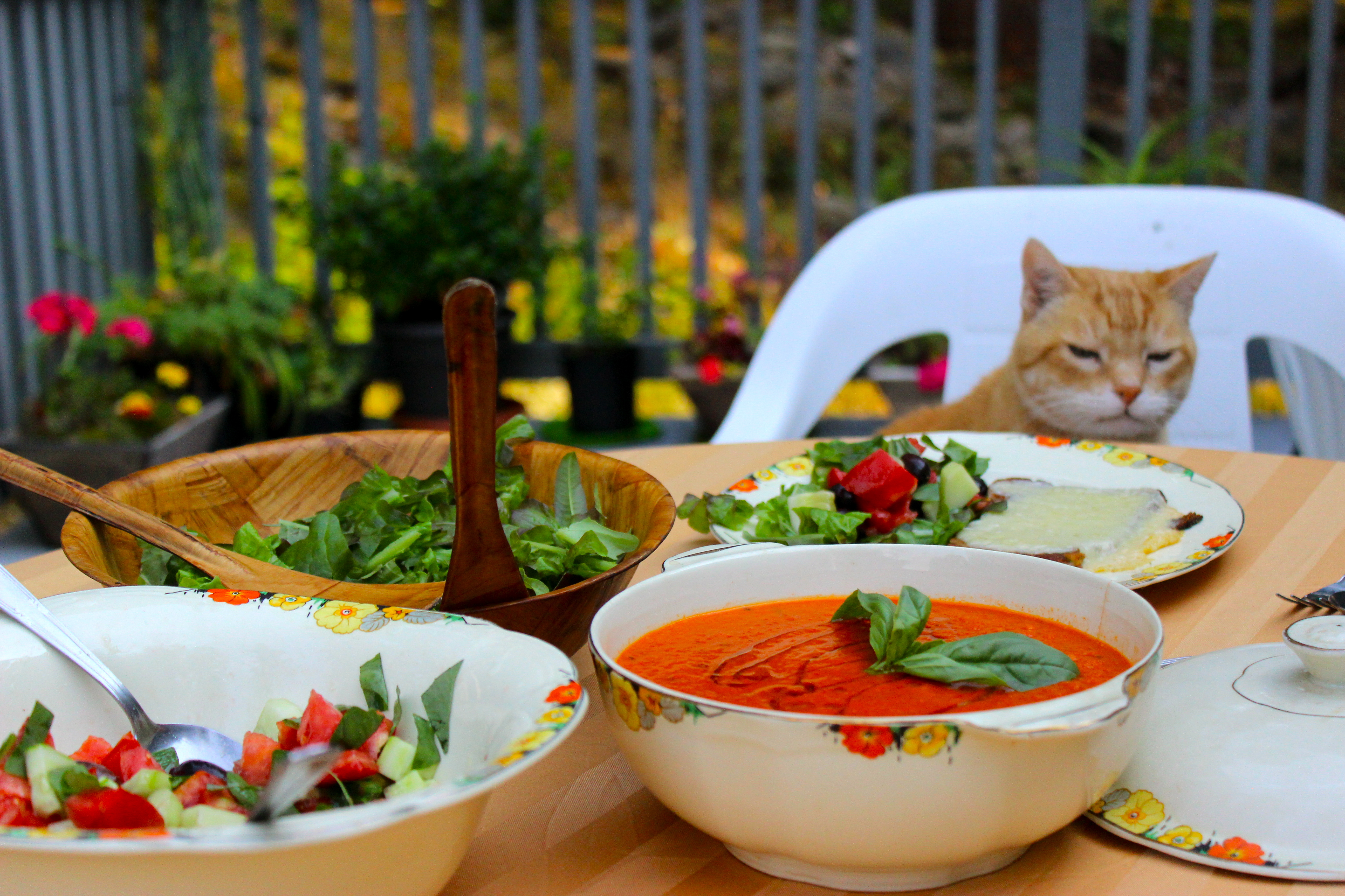 The almond meal gives the soup a bit of richness and creaminess (without cream) and the sherry works well with the Andalusian inspired flavours. You could use some other sort of booze like cognac or brandy and it would work just as well. As always, the adorable and expectant tabby cat is optional but highly recommended as the orange fur sets off the palate of the meal quite well.