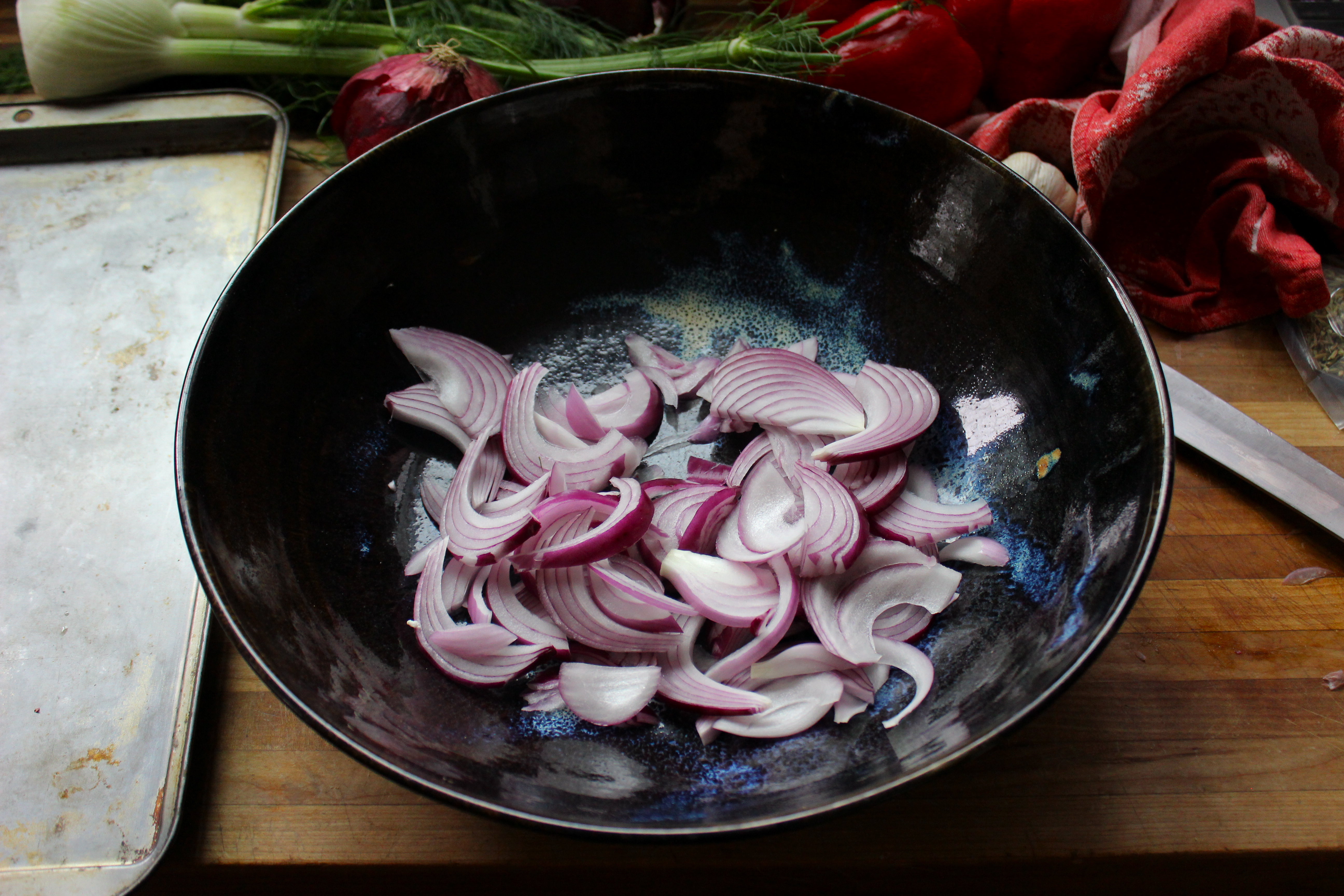 Red Onions for Roasted Vegetable Hash with Herbs in Pottery by Regina Wickham Posted by Big Sis Little Dish on September 11, 2015September 11, 2015 Red Onions for Roasted Vegetable Hash with Herbs in Pottery by Regina Wickham