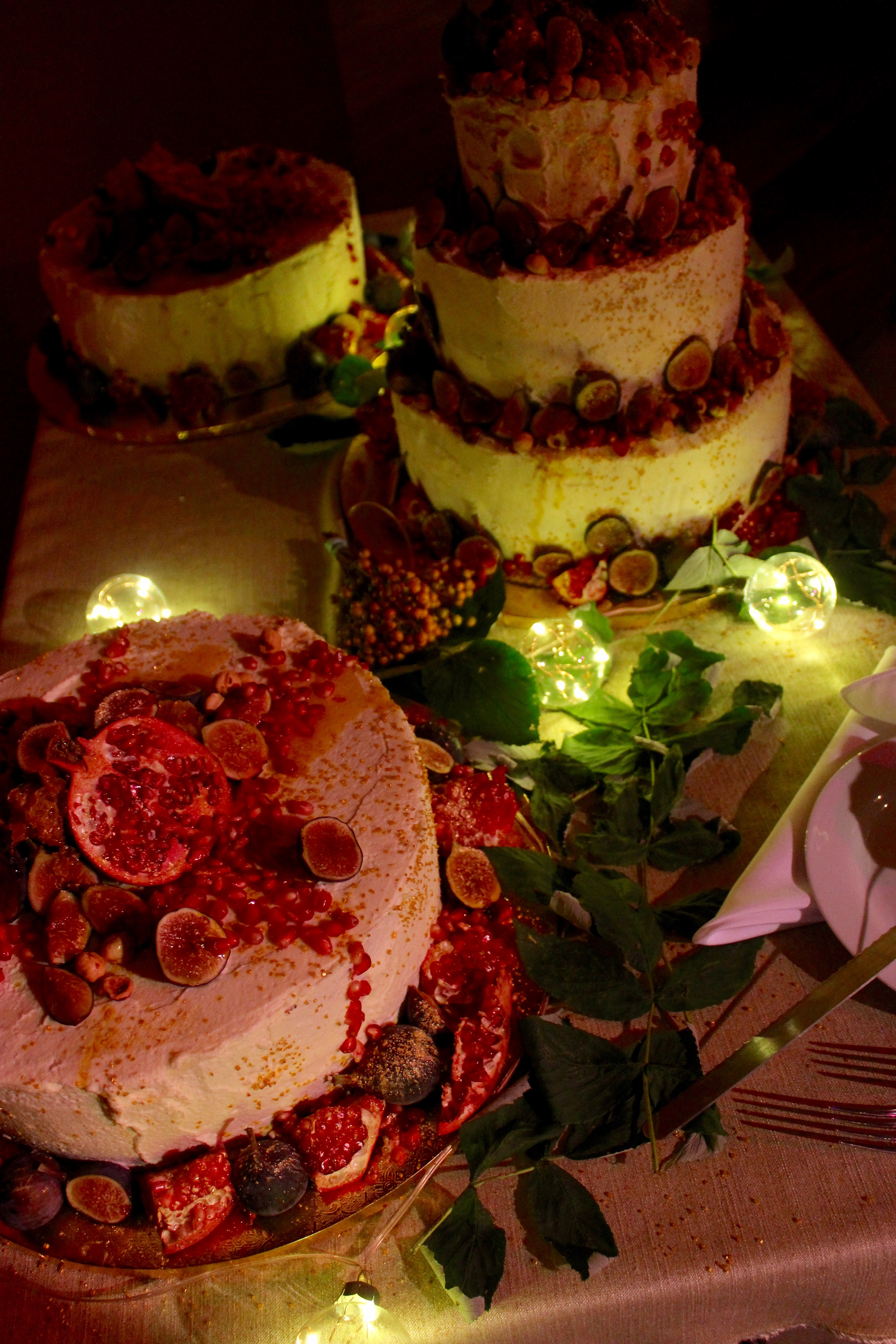 A Luscious Autumn Fertility Cake for Sxip and Coco’s Wedding- Hazelnut Brown Butter Financier with Pomegranate Curd, White Chocolate Icing, Fresh Figs, Pomegranates and Honeycomb (Gluten-Free)