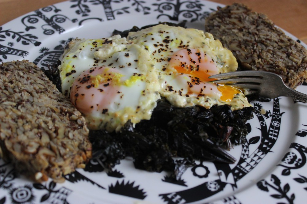 5. Serve over cooked greens and/or toast with a teaspoon of sour cream or thick yogurt on each egg.