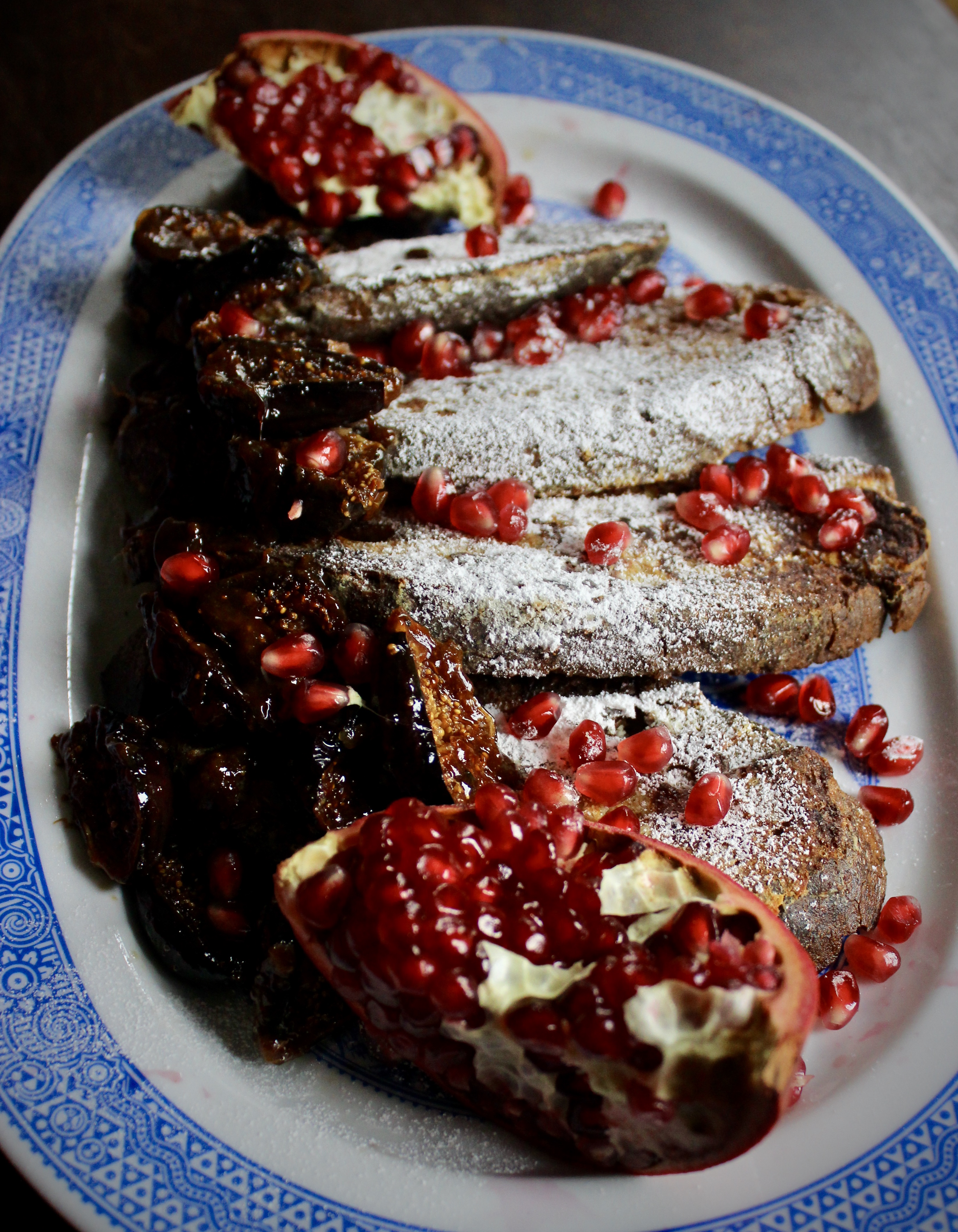 - Sift powdered sugar over the French toast. Don’t be shy. They should be thoroughly coated. Top with heaps of the caramelized figs and as much caramel as you can lift out of the pan. Sprinkle with pomegranate arils and serve!