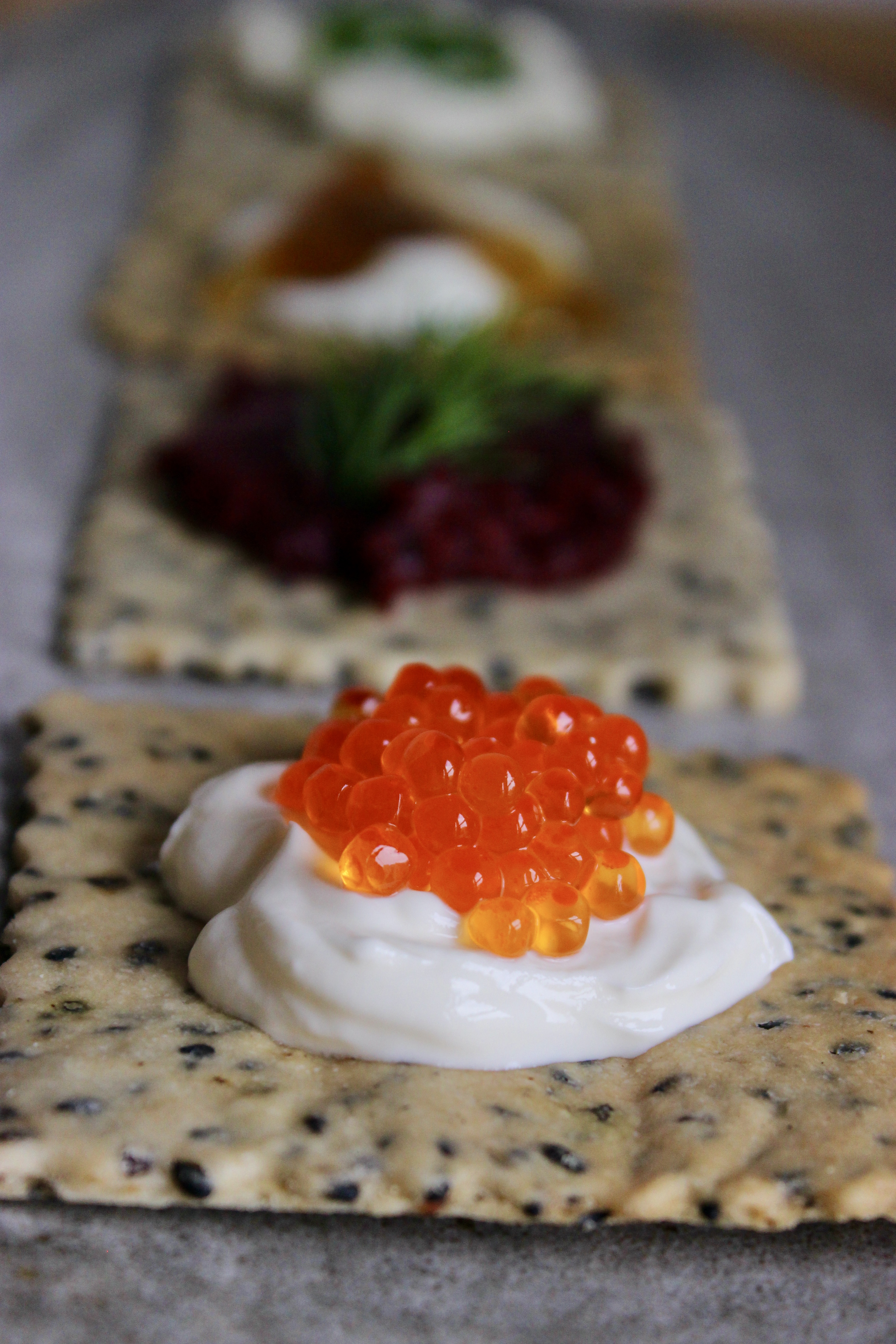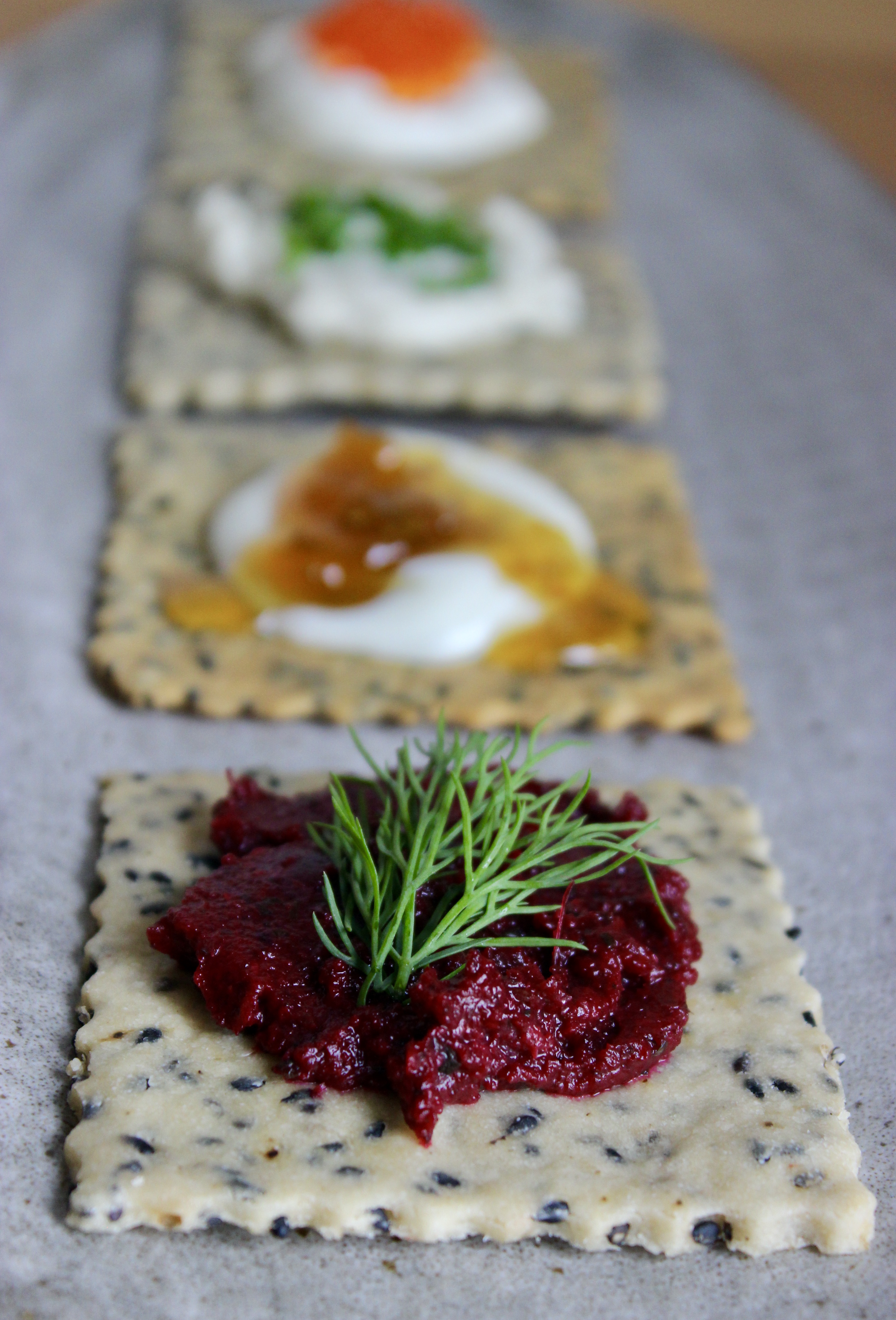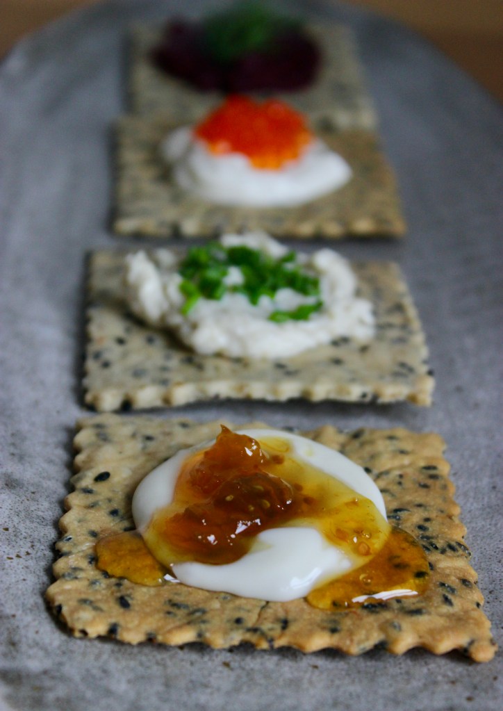 Do you still have your pandemic sourdough starter? I have mine, but I do not have so much time to bake bread. Maybe you have the same problem? This cracker recipe is so fast that it has allowed me to keep feeding my starter once or twice a week even though life has become overly full and busy again. It also makes truly delicious crackers for snacking on or making fancy appetizers (as shown in these photos from Christmas!)
