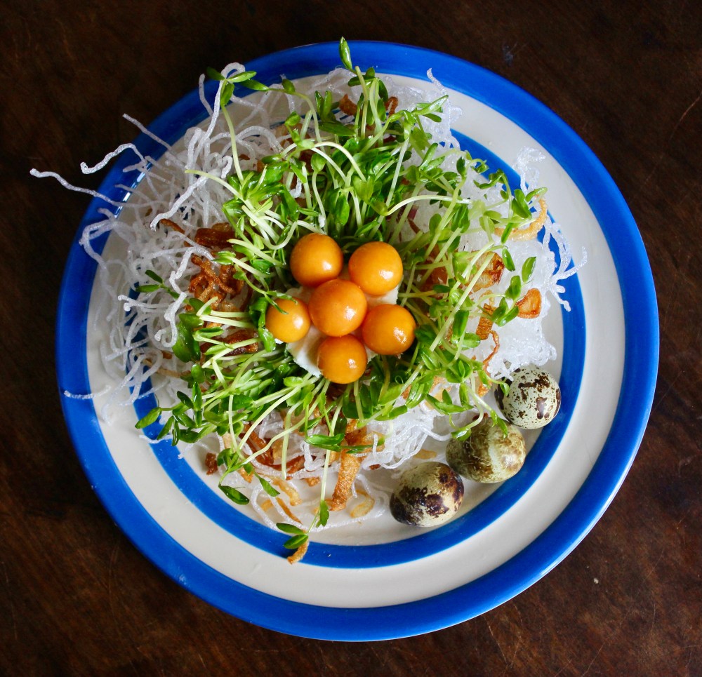 - Take a bundle of pea shoots (about 1 oz) with all of the stems facing the same direction. Swirl it in the sweet sesame dressing and place them stem side down in the center of the nest. Coax them to fan out in a radiating design. Symmetry is not so important!