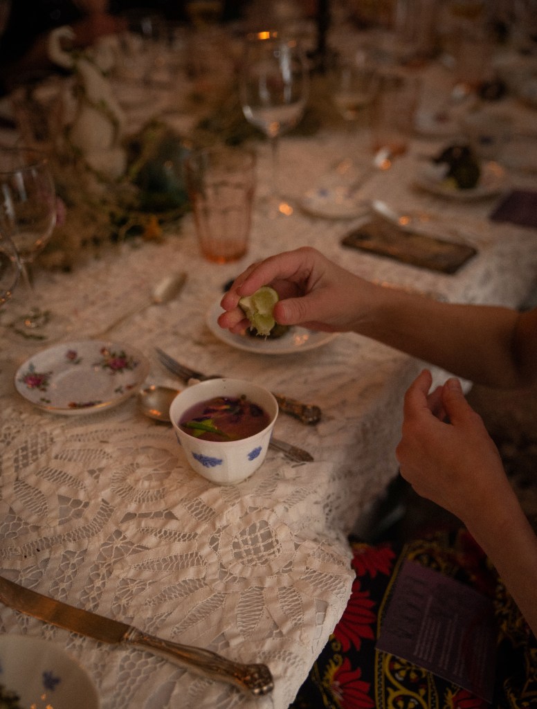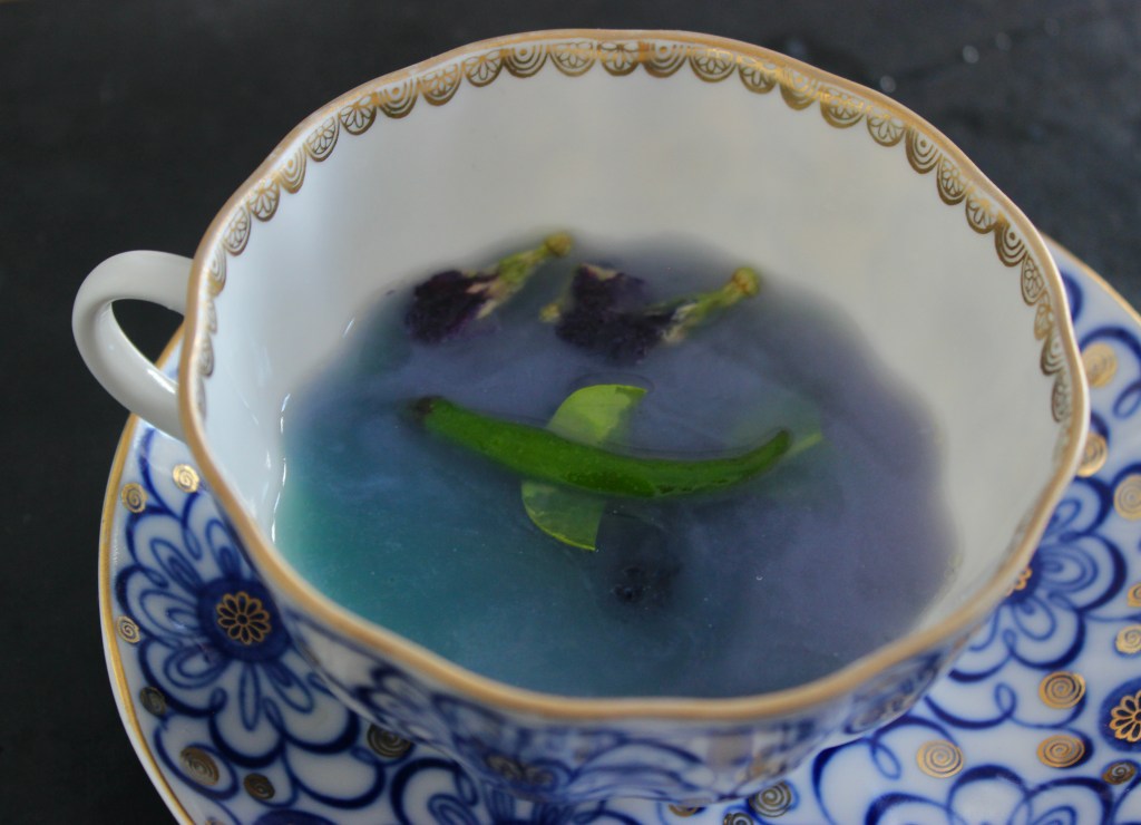 The servers poured steaming hot seafood broth into the tea cups. As the guests stirred the mixture, the clear golden broth interacted with the butterfly blossoms and turned a teal color. Then, they added lime and the color of the broth transformed again to mauve.