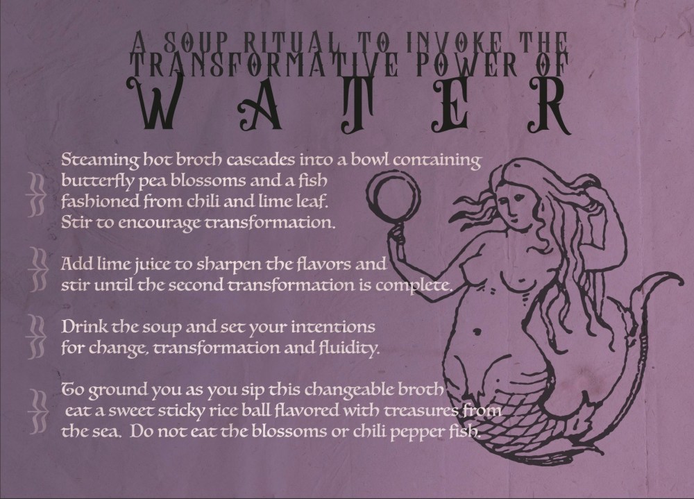 The butterfly pea blossoms will turn plain water a bright blue and will transform to a fushia color with the addition of acid, such as lemon juice. Depending on the PH of the liquid the they produce a wide range of color, including some truly unappetizing and murky hues of grey and green. In addition to transforming color, I wanted the broth to taste strongly of the sea. Creating a broth that had a rich seafood flavor AND the correct PH and clarity to interact well with the butterfly pea blossoms actually proved a bit of a challenge! Suffice it to say that my freezer was FULL of failed seafood broth experiments (which is a perfectly lovely problem to have). Don’t even get me started on how hard it was to make a the vegetarian stock that had a good flavor and did this trick. The solution ended involving coconut water.