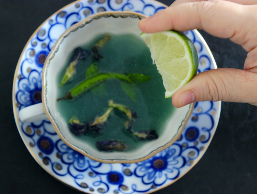 Butterfly pea blossoms naturally interact with the PH of the liquid they are steeped in and are used to create colorful desserts and drinks in Southeast Asia. The latin name is Clitoria Tiernatea because the flower resembles the female anatomy and it is considered an aphrodisiac. So basically, it was the perfect ingredient for an event made for and by women.