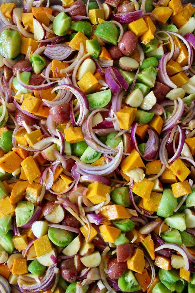 I ended up trying out a bunch of methods for preserving the tomatoes (and using them in cocktails!), which I will share later in the post. This year I created a roasted green tomato and squash recipe that I am ridiculously proud of so, I’m going to start there!