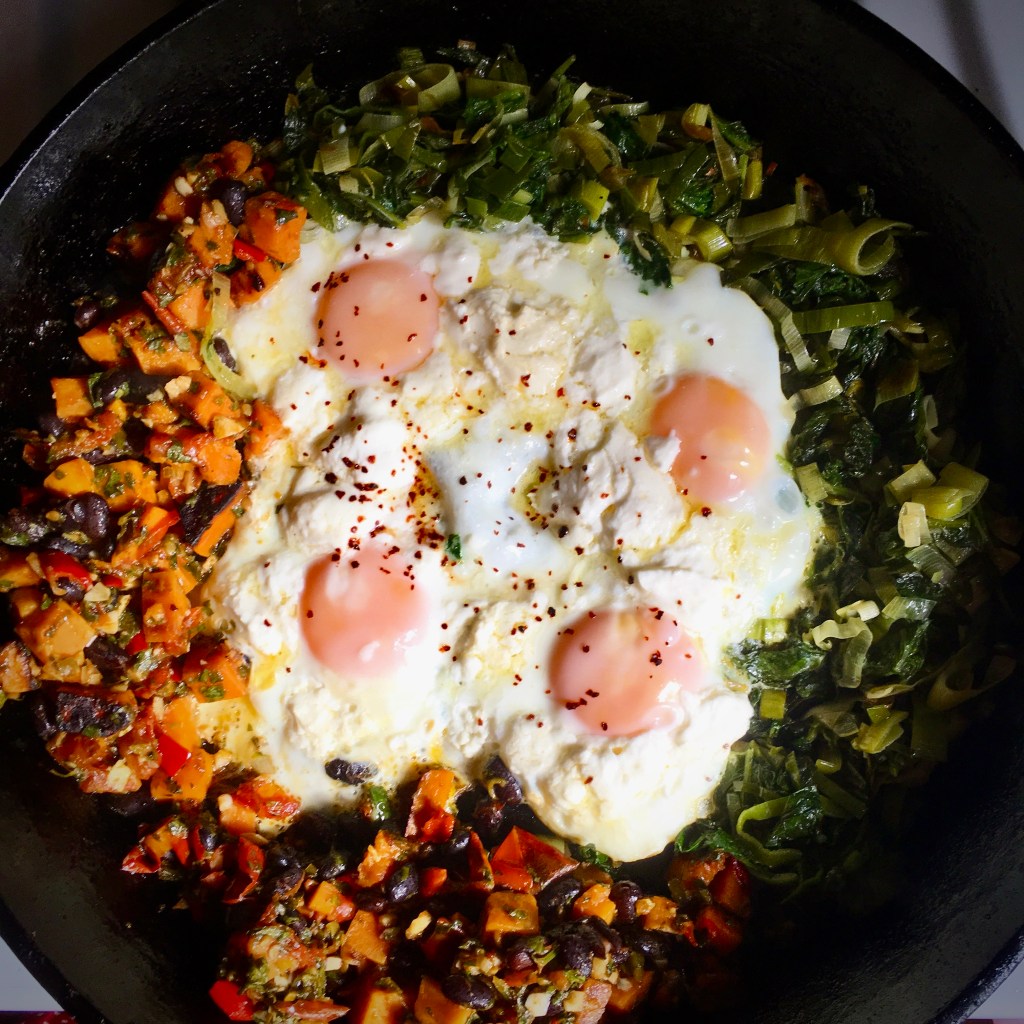 This can be any kind or mix of root vegetables although I personally would not use beets or turnips here. Potatoes, Yams, Sweet Potatoes and Rutabegas are all wonderful. Aromatics like fennel, peppers onions, whole cloves of garlic and herbs like rosemary and thyme are all optional additions. I’ve also done this breakfast with roasted cauliflower and it was great. Sometimes I add beans. Use what you have and what is in season!