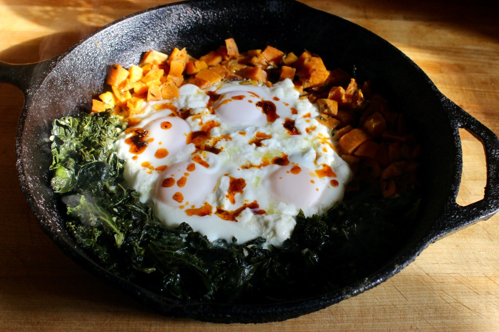 My husband and I call this “Skillet Breakfast” because we make it in our giant cast iron skillet and usually eat it directly out of the pan. We also eat it sometimes for dinner. It evolved directly out of the need to process as much of our farmshare as we could on the weekend, so that the vegetables were prepared and ready to eat with as little fuss as possible later in the week. It is a wildly adaptable “recipe”. I suppose it would work in a different kind of pan, but the vegetables get wonderfully crisped up on the edges in a cast iron!