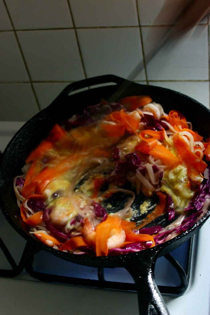 - Push the noodles, shrimp and veg to the side and crack the eggs in the center. Cook for about 20 seconds or until the edges of the egg start to set. Scample the eggs roughly and then toss them with the noodles and veg while the eggs are still soft.
