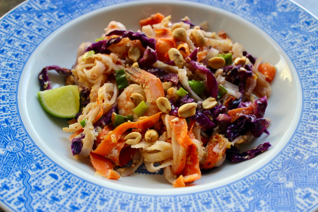 - Once the eggs have coated the noodles and veg and seem mostly cooked (less than a minute), toss in any bok choy, snow peas, snap peas or peppers you are using along with the scallion and peanut mixture. These will cook from contact with the hot noodles.