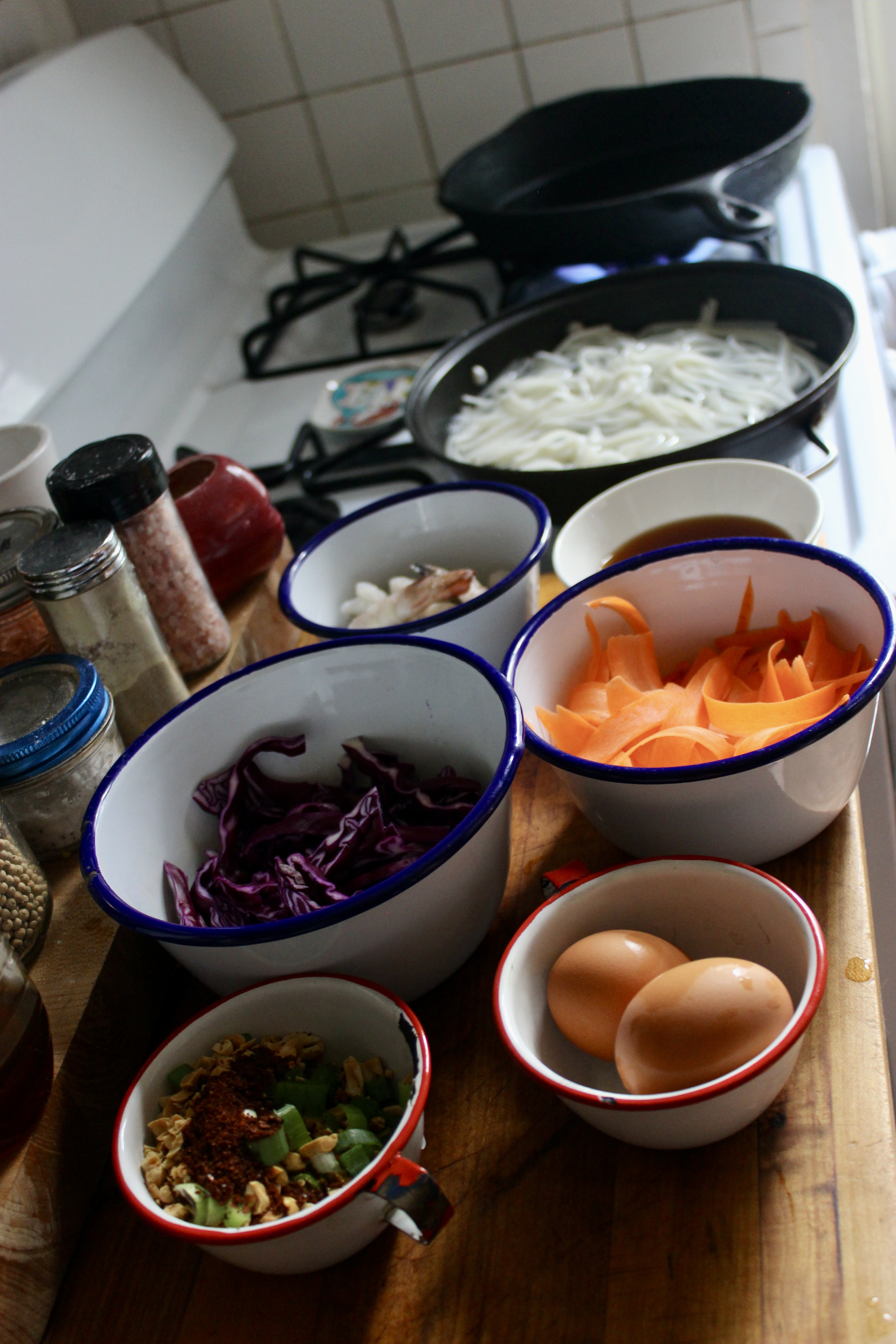 - Soak the noodles in hot water from the kettle until they are pliable enough to wrap around your finger. I prep the rest of the ingredients while they soak. When they are pliable, drain them and set near the stove. Don’t over soak them or you will have mushy Pad Thai. They should finish cooking in the sauce.