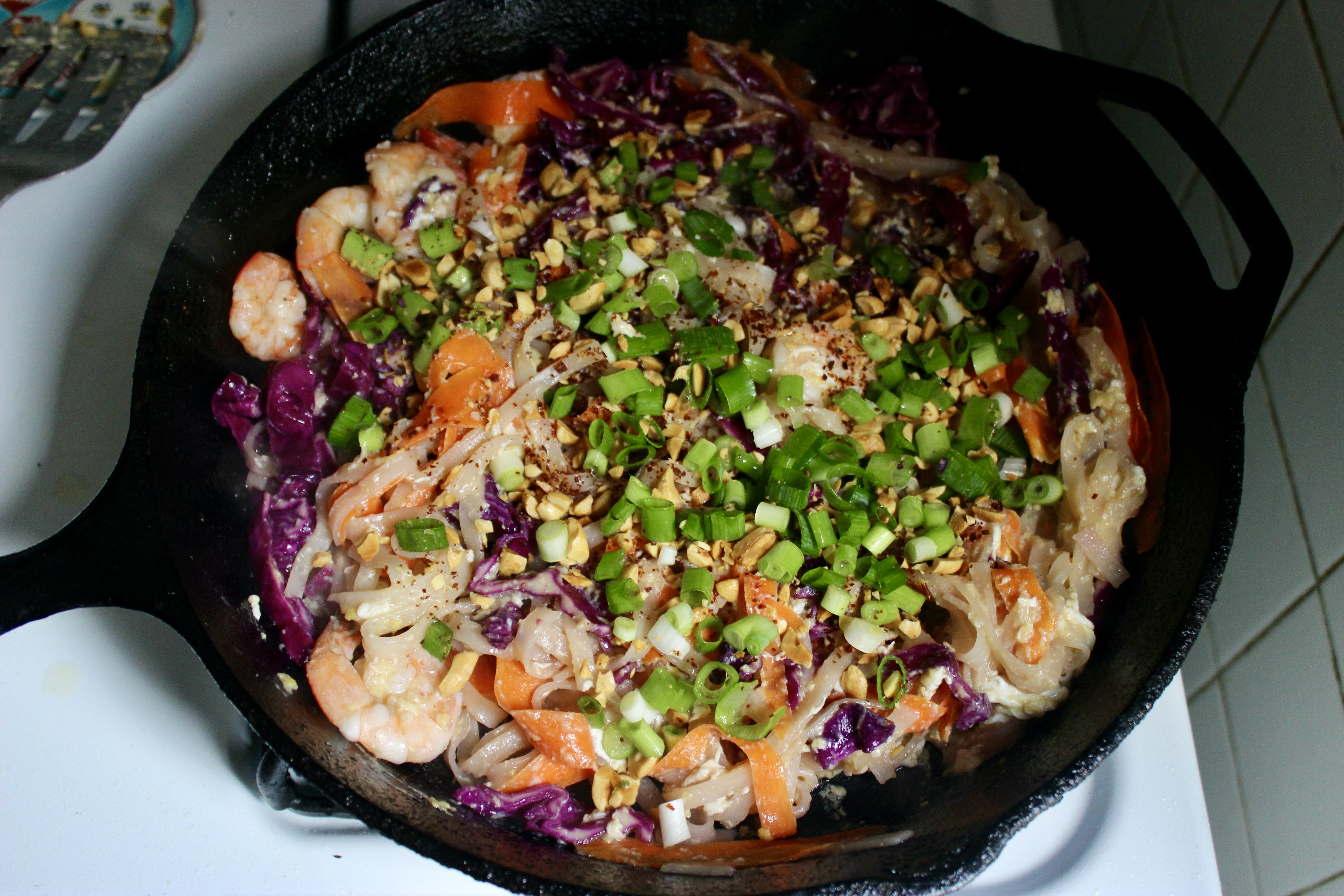 - Once the eggs have coated the noodles and veg and seem mostly cooked (less than a minute), toss in any bok choy, snow peas, snap peas or peppers you are using along with the scallion and peanut mixture. These will cook from contact with the hot noodles.