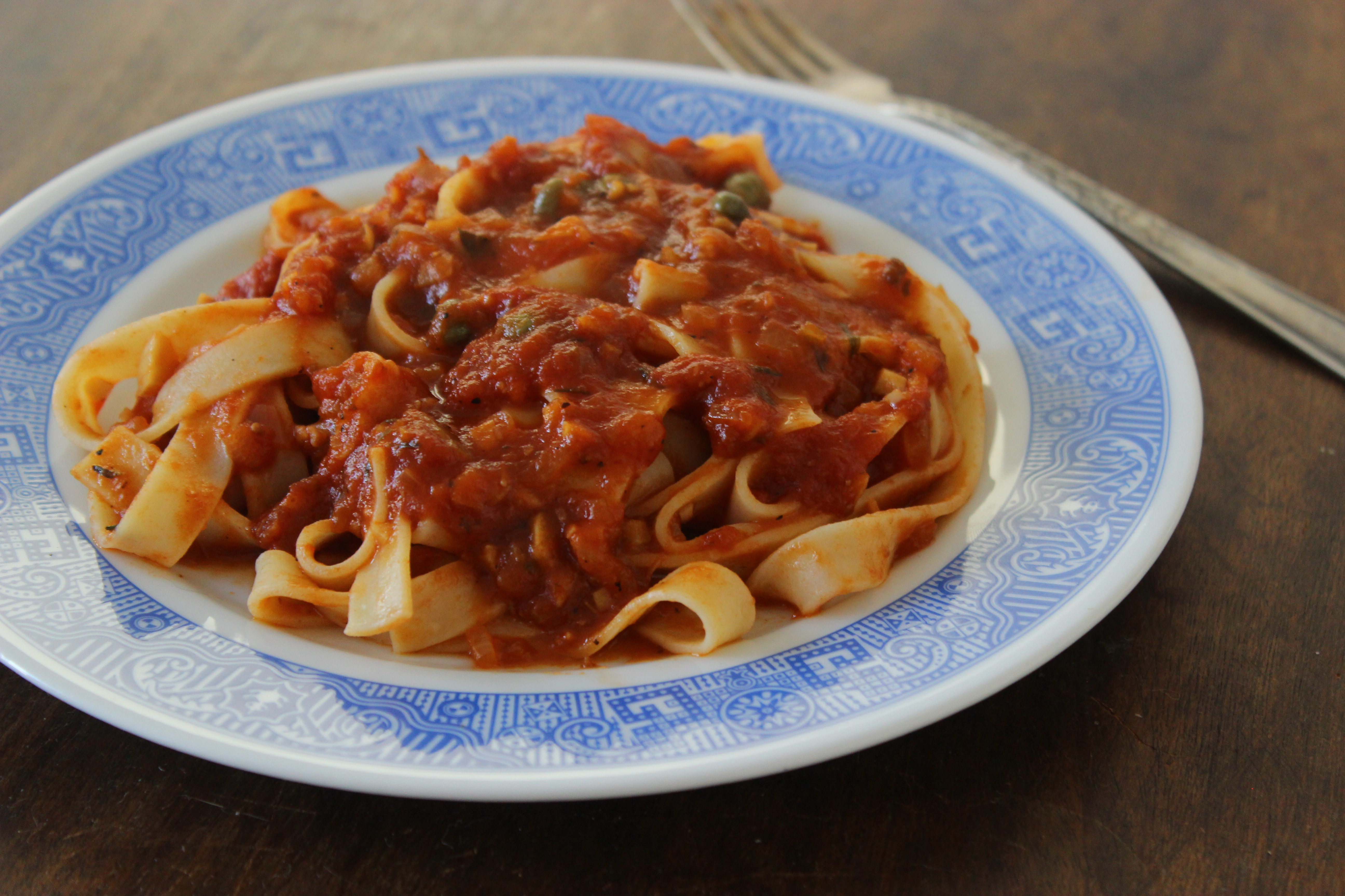 Next up in the project of posting simple things that I cook often, is my version of Puttanesca Sauce. Puttanesca sauce is a tomato sauce for pasta flavored with whatever umami bombs you might have in your pantry. So, traditionally that would be anchovies, capers, olives, garlic and chilis. I do not keep olives on hand, so my version does not have olives. My version has fish sauce, which is a south east Asian sauce made from anchovies that I try to always have around because I cook a lot of Asian food. I love fish sauce. Sometimes I use just fish sauce (if I’m out of anchovies) or just anchovies (if I’m out of fish sauce). I like this sauce best if I use BOTH. I really like anchovies. If you do not care for anchovies, you will not like this. So, clearly my recipe is not traditional. I actually think that I might try adding some kim chee juice to my next batch of Puttenesca. Hear me out. The beauty of this sauce is that it uses flavorful things that you might have in your pantry to make a sauce without having to run out and buy anything fresh. I always have kim chi and it is a funky, spicy, fishy umami bomb that would not be out of place in this sauce. Maybe you keep gochujang on hand? That would work too.