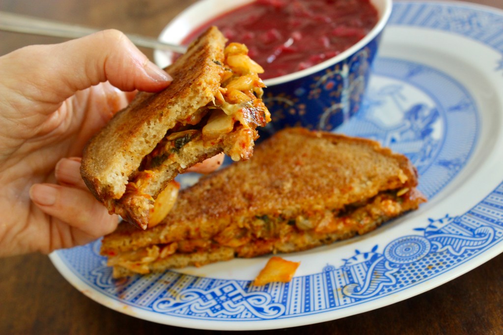 It is really astonishing how often I eat kimchi grilled cheese with hot borscht in the winter. It is comforting, filling and deeply nourishing. The kimchi grilled cheese is fatty and salty. The borscht is tangy and a bit sweet. It’s just a perfect combo.