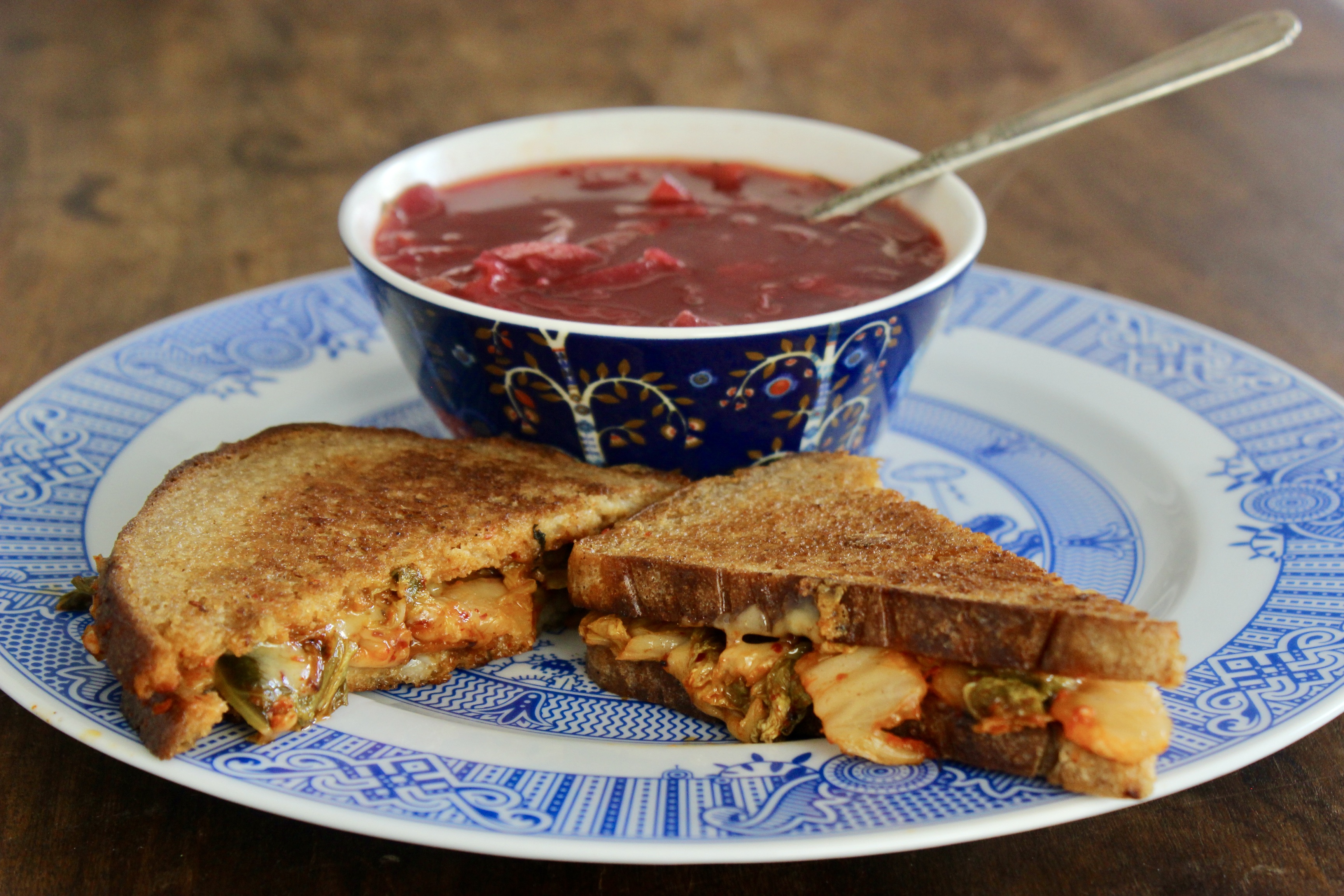 Now let’s talk about hot borcht. I have a really good hot borscht recipe. You should make it. In the fall, my farmshare sends all the ingredients for hot borscht in huge quantities and by the time the new year rolls around my freezer is wall to wall frozen borsct. Borscht actually tastes better after it’s been frozen. It likes to have time to blend. Maybe it’s just that hot borscht tastes better in dead of winter? You should eat hot borscht with kimchi grilled cheese.