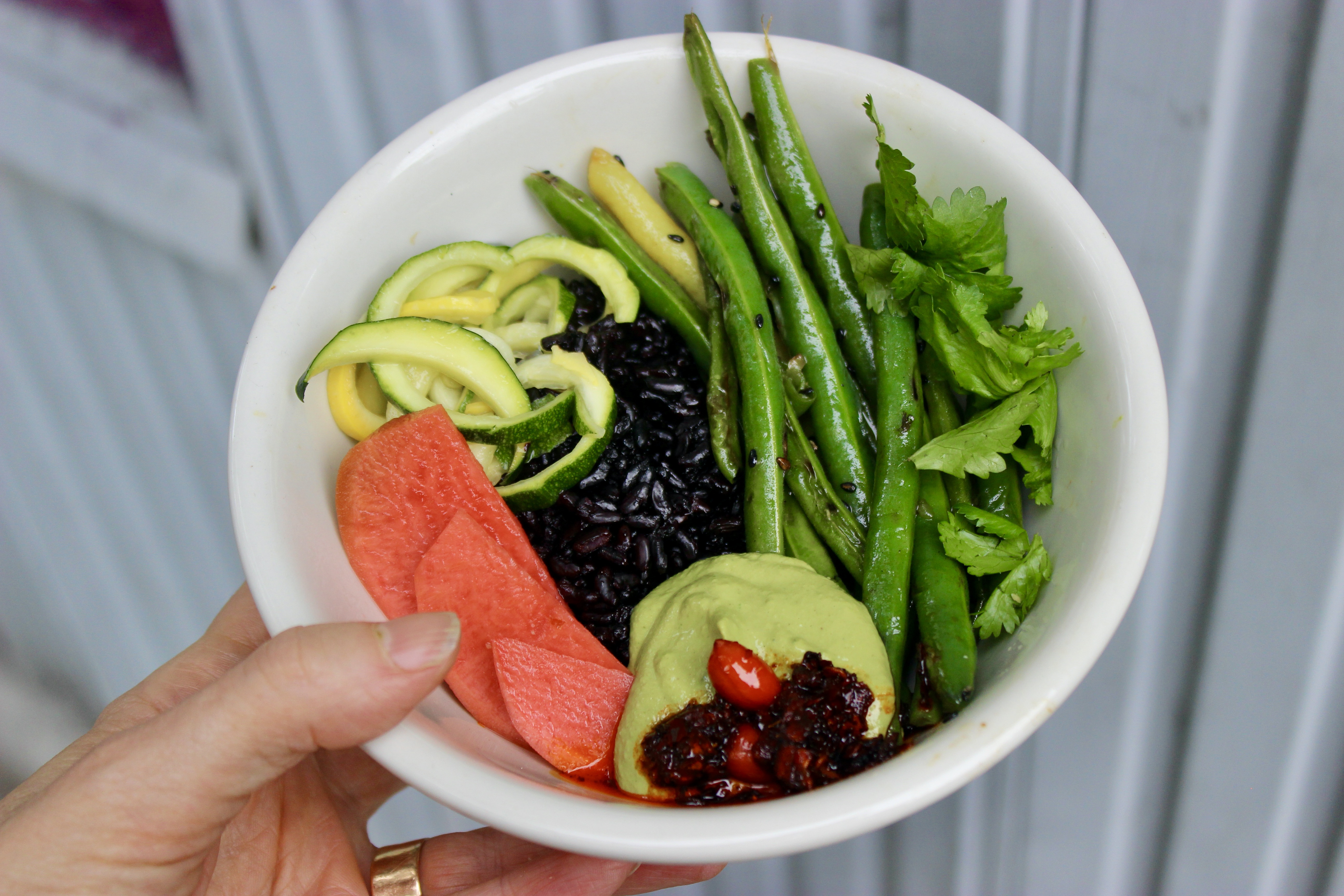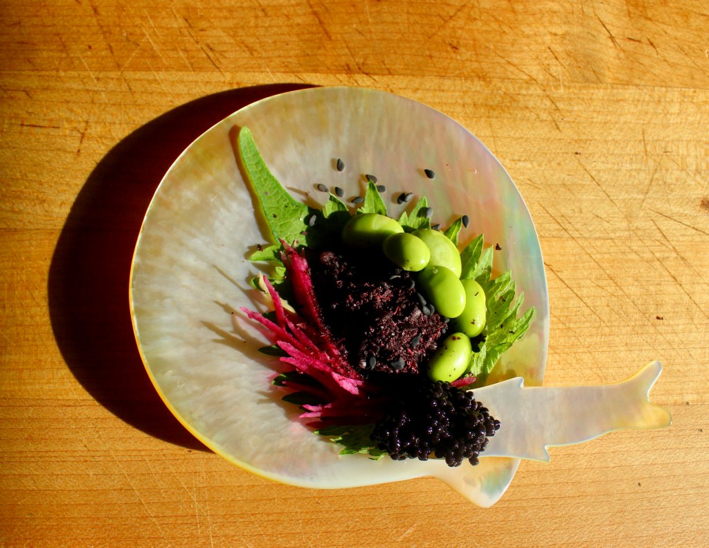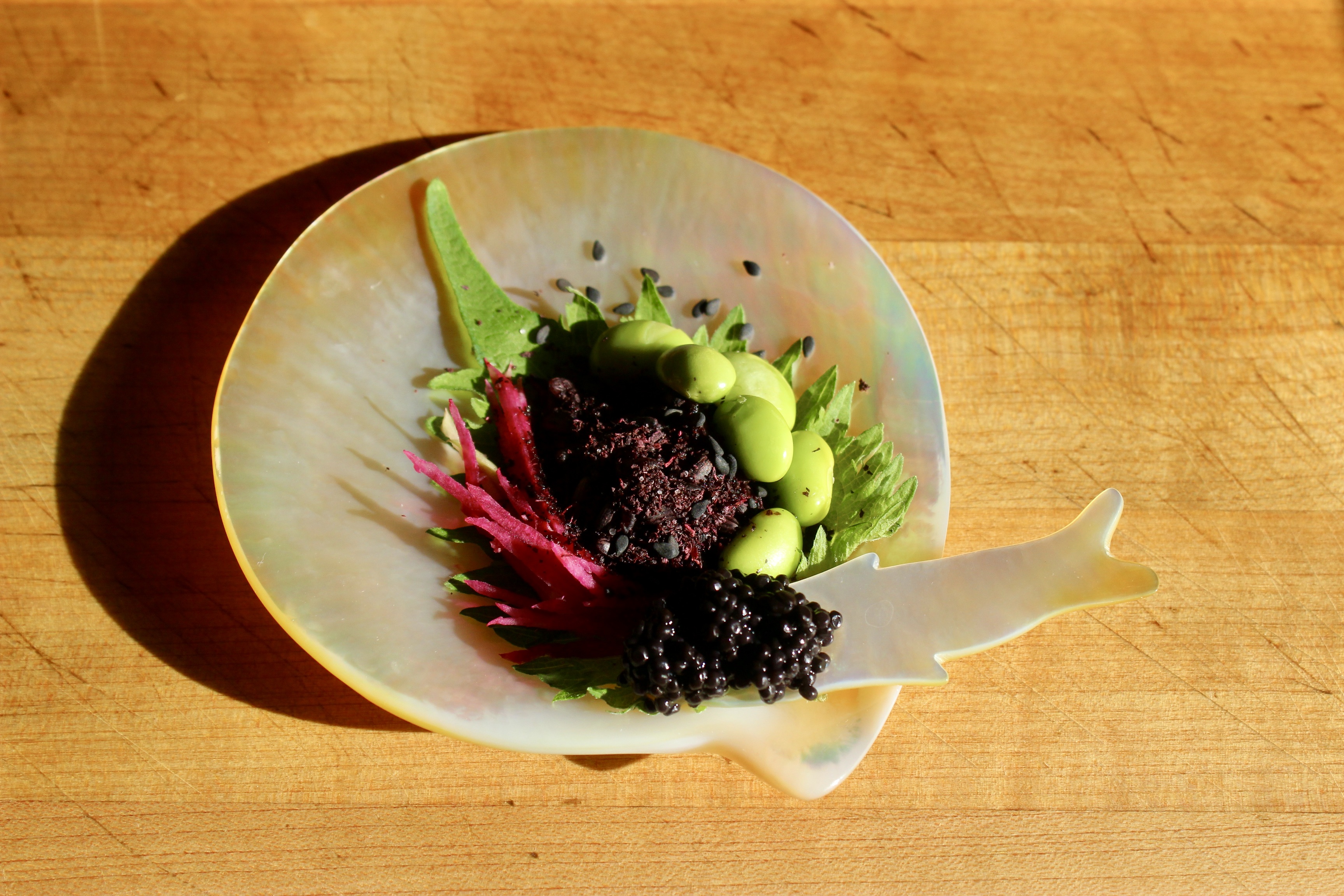 The composed appetizer (pictured above) requires a bit of well timed advance prep and meticulous plating. It was a bit stressful to plate for 40 people! It would be very special and not too stressful for a romantic dinner or small, fancy dinner party. The leftovers make an outragously delicous (and easy) salad (below right) . You could also just make the easy and delicious salad and serve the caviar on shiso leaves as a super simple appetizer (below middle). I’ve posted directions for all these options if you scroll down in this post! The leftover salad is so delicious, beautiful and easy that I was inspired to make black rice bowls (below left) with the kids who I work with at the Run a Luncheonette Cooking Camp. So, if you would like to see a summer version of this dish check out this post .