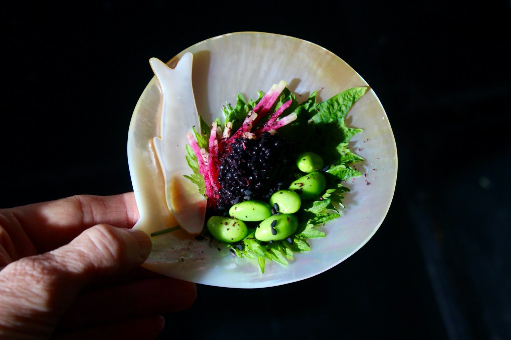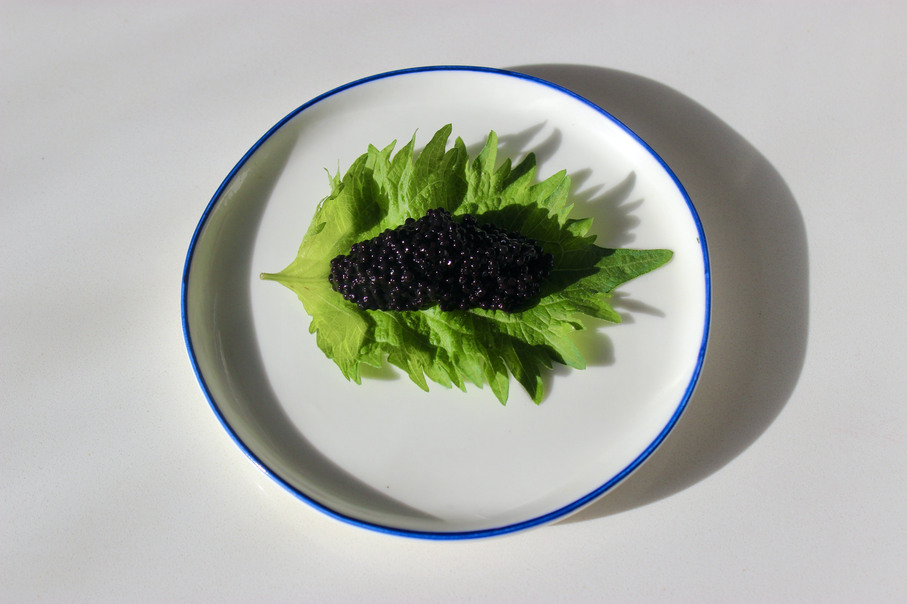 - Place a tiny teaspoon of caviar near the stem of the shiso on the watermelon radish side of the plate.