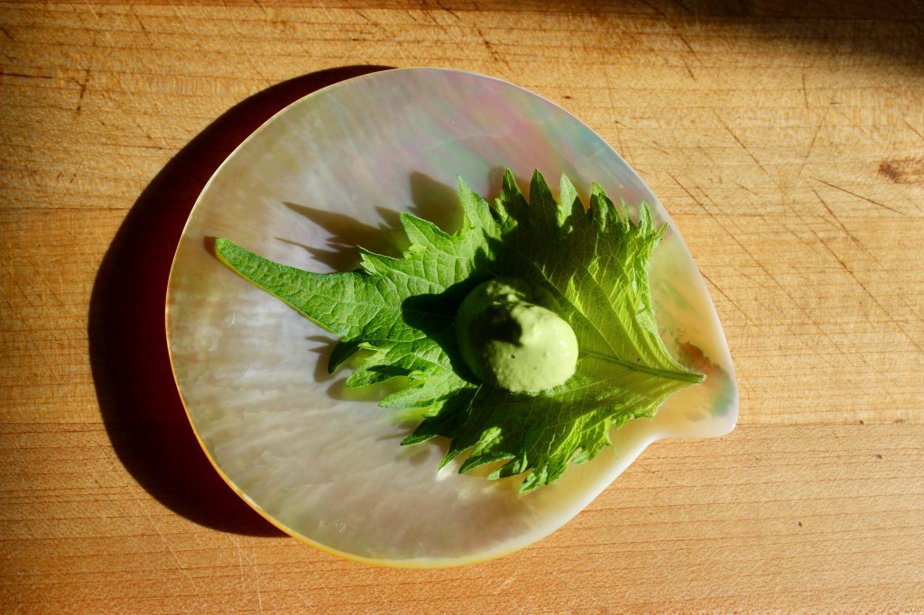 - Put a perfect shiso leaf on the plate and add a small dollop of shiso cream to the middle of the leaf.