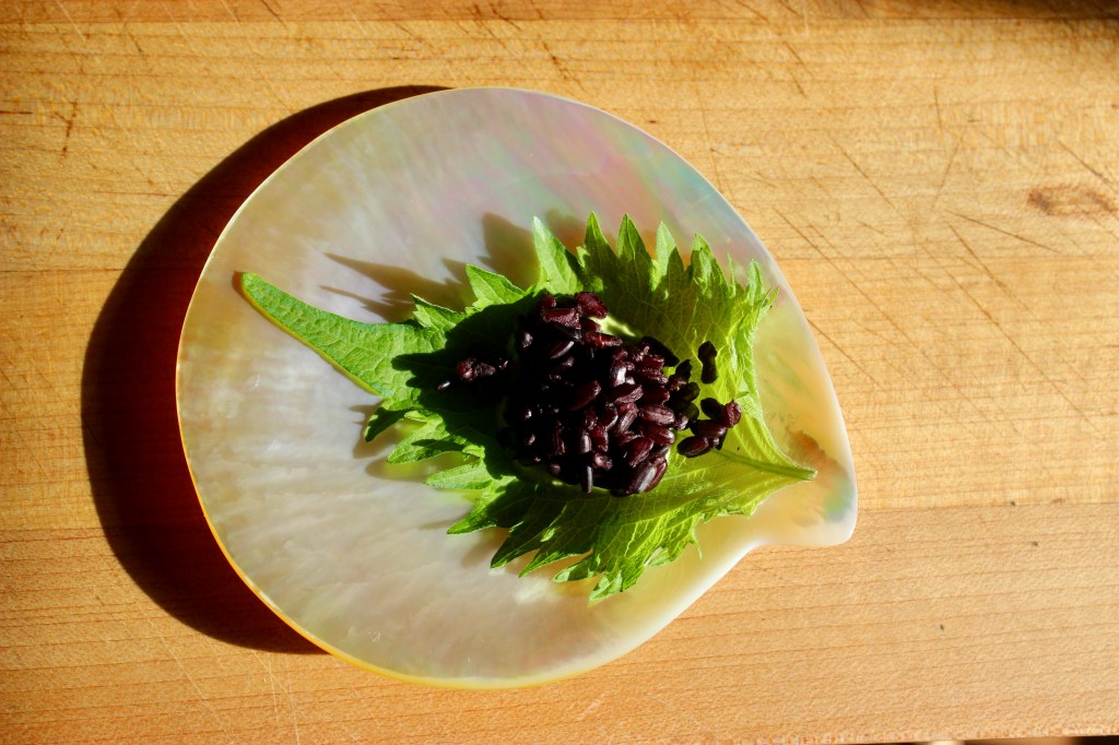 - Totally cover the exposed black rice with about 1/4 teaspoon of Shiso Fumi and sprinkle a pinch of black sesame on or near the edamame