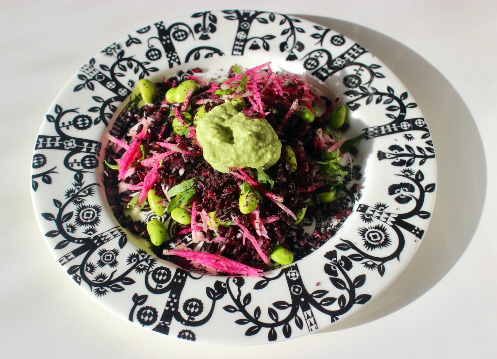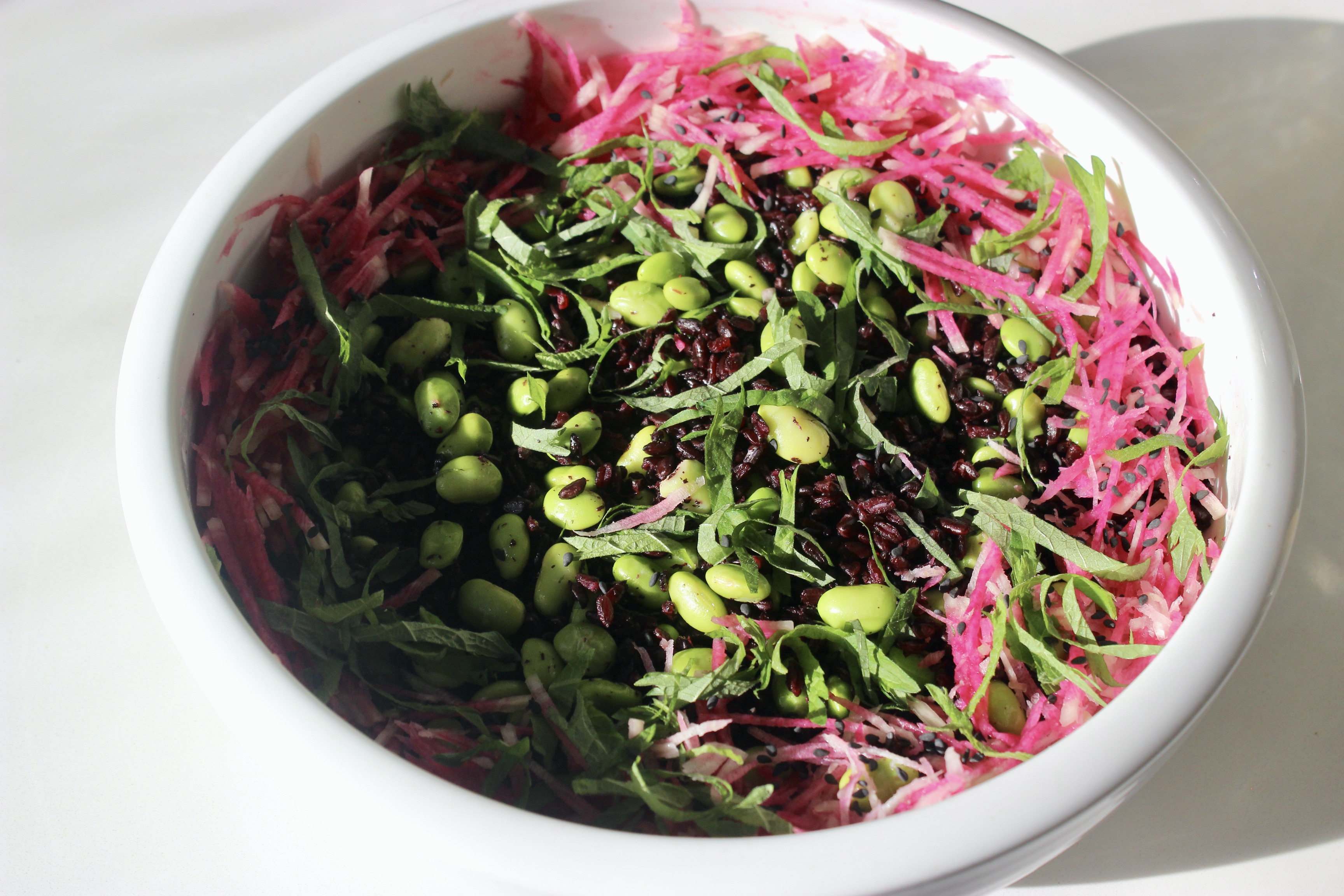 Toss the cooked black rice and edamame beans with glug of sesame oil, the juice of 1 lemon (strained) and salt to taste.. Garnish with shredded watermelon radish and shiso leaves cut into thin ribbons. Toss a dollop of leftover shiso cream on top of each serving and season generousy with Shiso Fumi and optional black sesame seeds.