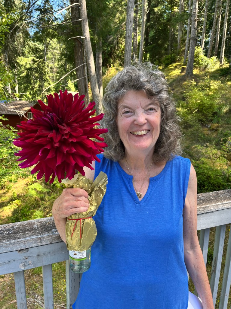 Here is a photo of my mother holding a birthday Dahlia bigger than her head that a friend grew and brought to the party.